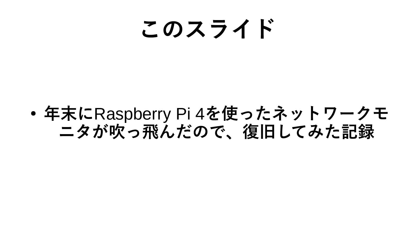 このスライド • 年末にRaspberry Pi 4を使ったネットワークモ ニタが吹っ飛んだので、復旧してみた記録
