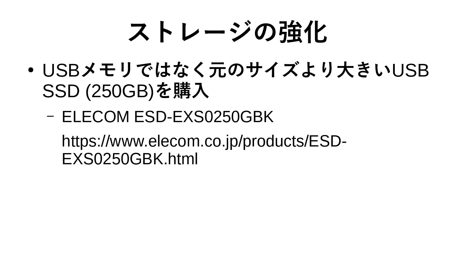 ストレージの強化 • USBメモリではなく元のサイズより大きいUSB SSD (250GB)を購入 – ELECOM ESD-EXS0250GBK https://www.elecom.co.jp/products/ESD- EXS0250GBK.html