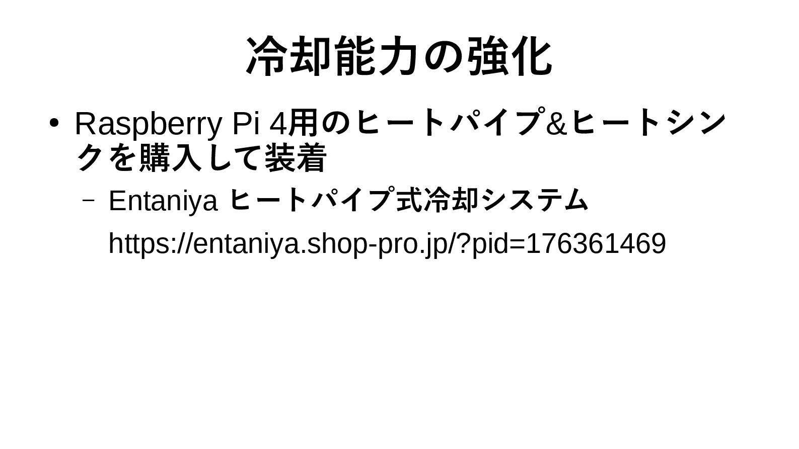 冷却能力の強化 • Raspberry Pi 4用のヒートパイプ&ヒートシン クを購入して装着 – Entaniya ヒートパイプ式冷却システム https://entaniya.shop-pro.jp/?pid=176361469