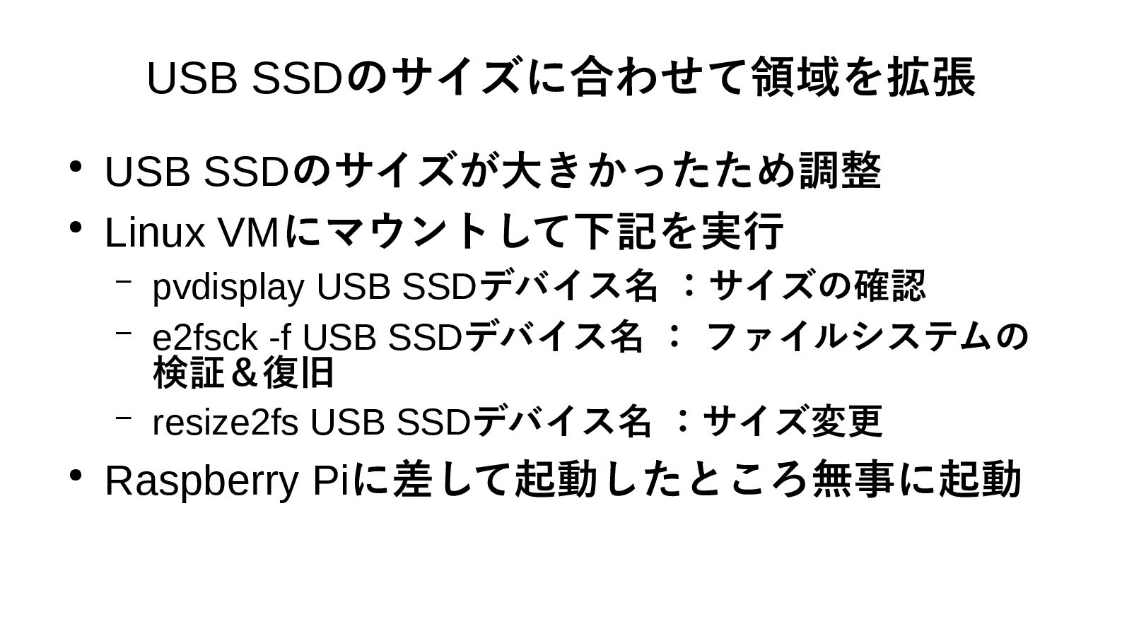 USB SSDデバイス名 :サイズの確認 – e2fsck -f USB SSDデバイス名 : ファイルシステムの 検証&復旧 – resize2fs USB SSDデバイス名 :サイズ変更 • Raspberry Piに差して起動したところ無事に起動