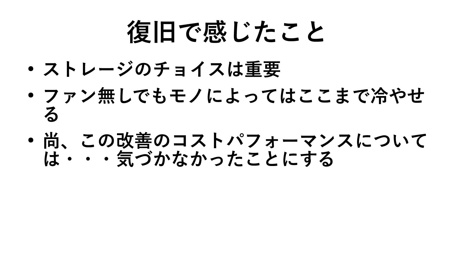 復旧で感じたこと • ストレージのチョイスは重要 • ファン無しでもモノによってはここまで冷やせ る • 尚、この改善のコストパフォーマンスについて は・・・気づかなかったことにする