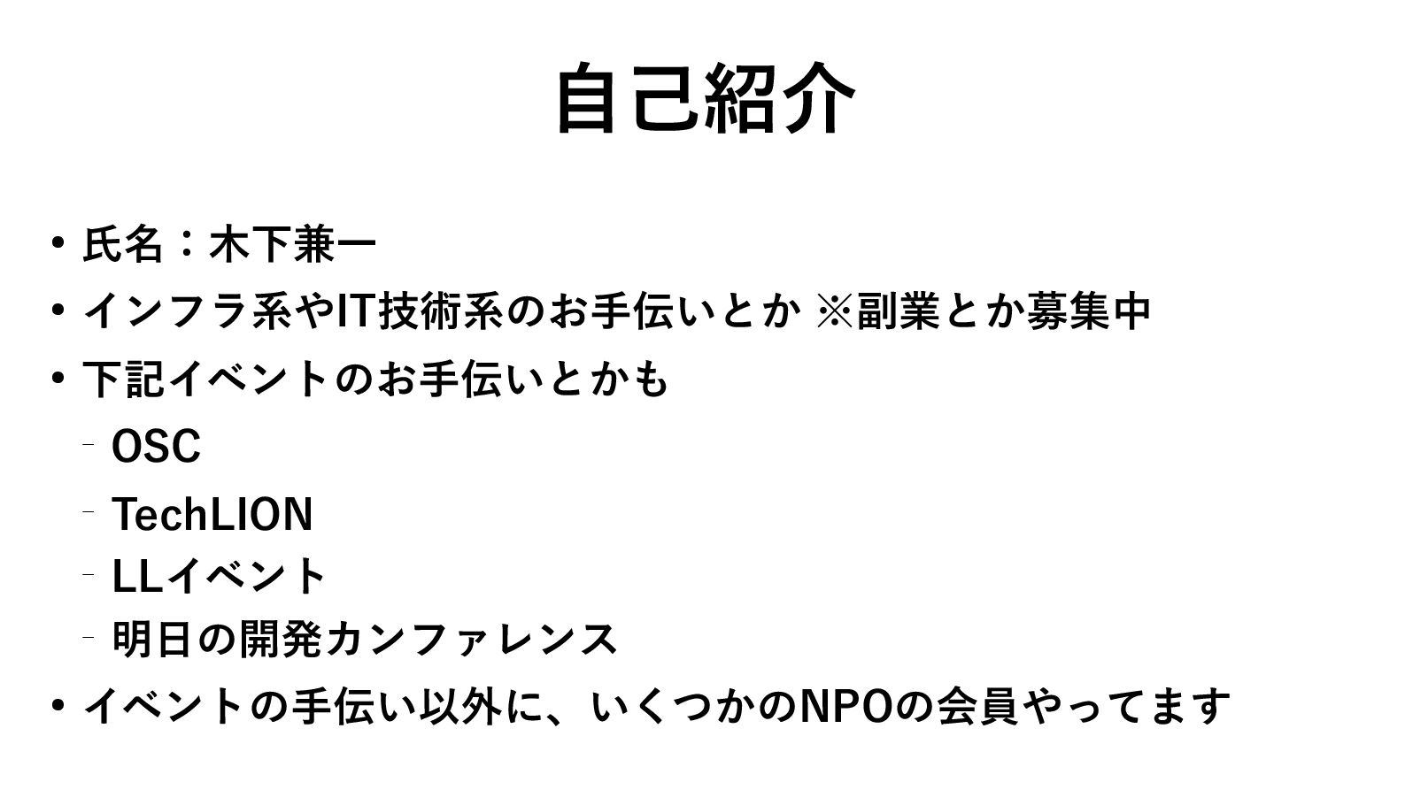 自己紹介 • 氏名:木下兼一 • インフラ系やIT技術系のお手伝いとか ※副業とか募集中 • 下記イベントのお手伝いとかも ─ OSC