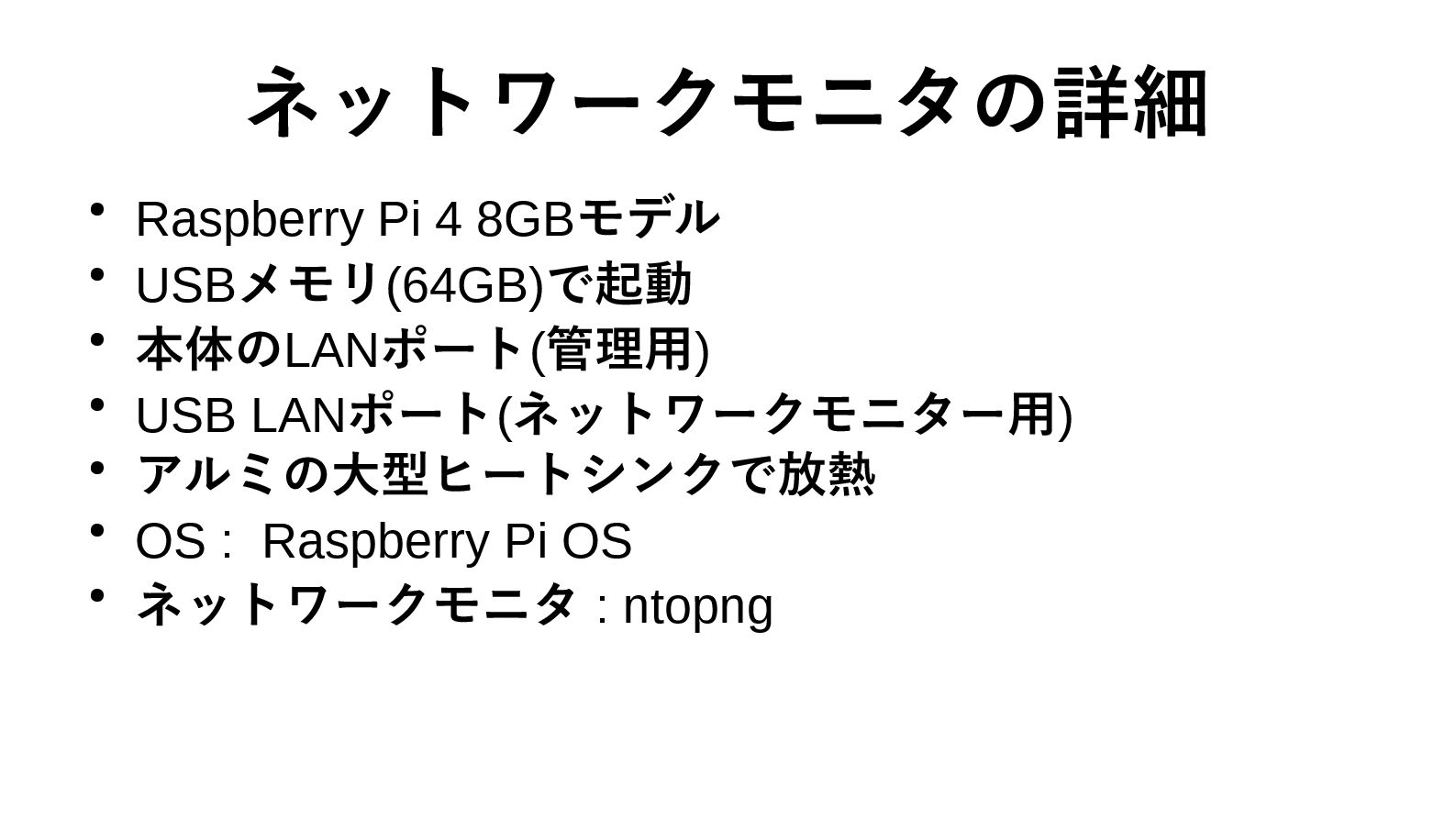 ネットワークモニタの詳細 • Raspberry Pi 4 8GBモデル • USBメモリ(64GB)で起動 • 本体のLANポート(管理用)