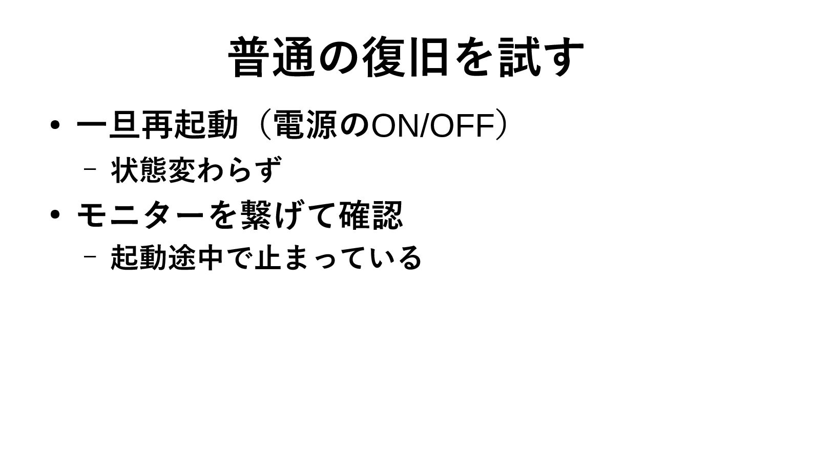 普通の復旧を試す • 一旦再起動(電源のON/OFF) – 状態変わらず • モニターを繋げて確認 – 起動途中で止まっている