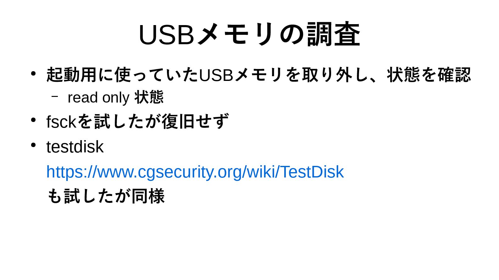 USBメモリの調査 • 起動用に使っていたUSBメモリを取り外し、状態を確認 – read only 状態 • fsckを試したが復旧せず •