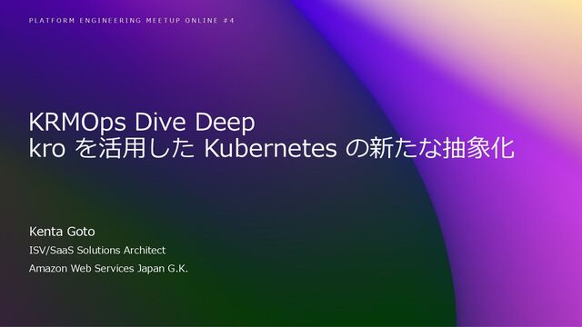 rights reserved. 1 Kenta Goto P L A T F O R M E N G I N E E R I N G M E E T U P O N L I N E # 4 ISV/SaaS Solutions Architect Amazon Web Services Japan G.K. KRMOps Dive Deep kro を活⽤した Kubernetes の新たな抽象化