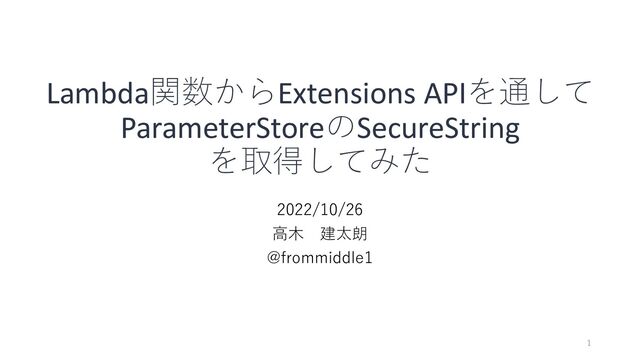 16:03:32 PARAMETERS_SECRETS_EXTENSION_LOG_LEVEL is not present. Log level set to info. [AWS Parameters and Secrets Lambda Extension] 2022/10/25 16:03:32 INFO Systems Manager Parameter Store and Secrets Manager Lambda Extension 1.0.94 [AWS Parameters and Secrets Lambda Extension] 2022/10/25 16:03:32 INFO Serving on port 2773 EXTENSION Name: AWSParametersAndSecretsLambdaExtension State: Ready Events: [INVOKE,SHUTDOWN] START RequestId: cd17720e-ddd7-450c-9fae-b99d9148c30d Version: $LATEST [AWS Parameters and Secrets Lambda Extension] 2022/10/25 16:03:32 INFO ready to serve traffic My Parameter : This is encrypted value for Jaws-UG. END RequestId: cd17720e-ddd7-450c-9fae-b99d9148c30d REPORT RequestId: cd17720e-ddd7-450c-9fae-b99d9148c30d Duration: 587.36 ms Billed Duration: 588 ms Memory Size: 128 MB Max Memory Used: 65 MB Init Duration: 271.40 ms • 無事Lambda Extensionから値を取得することができました。 15