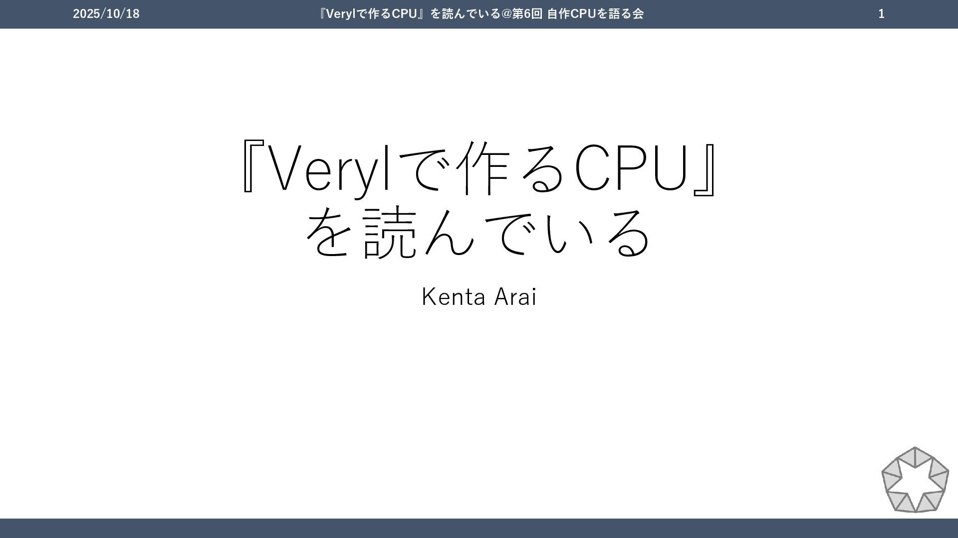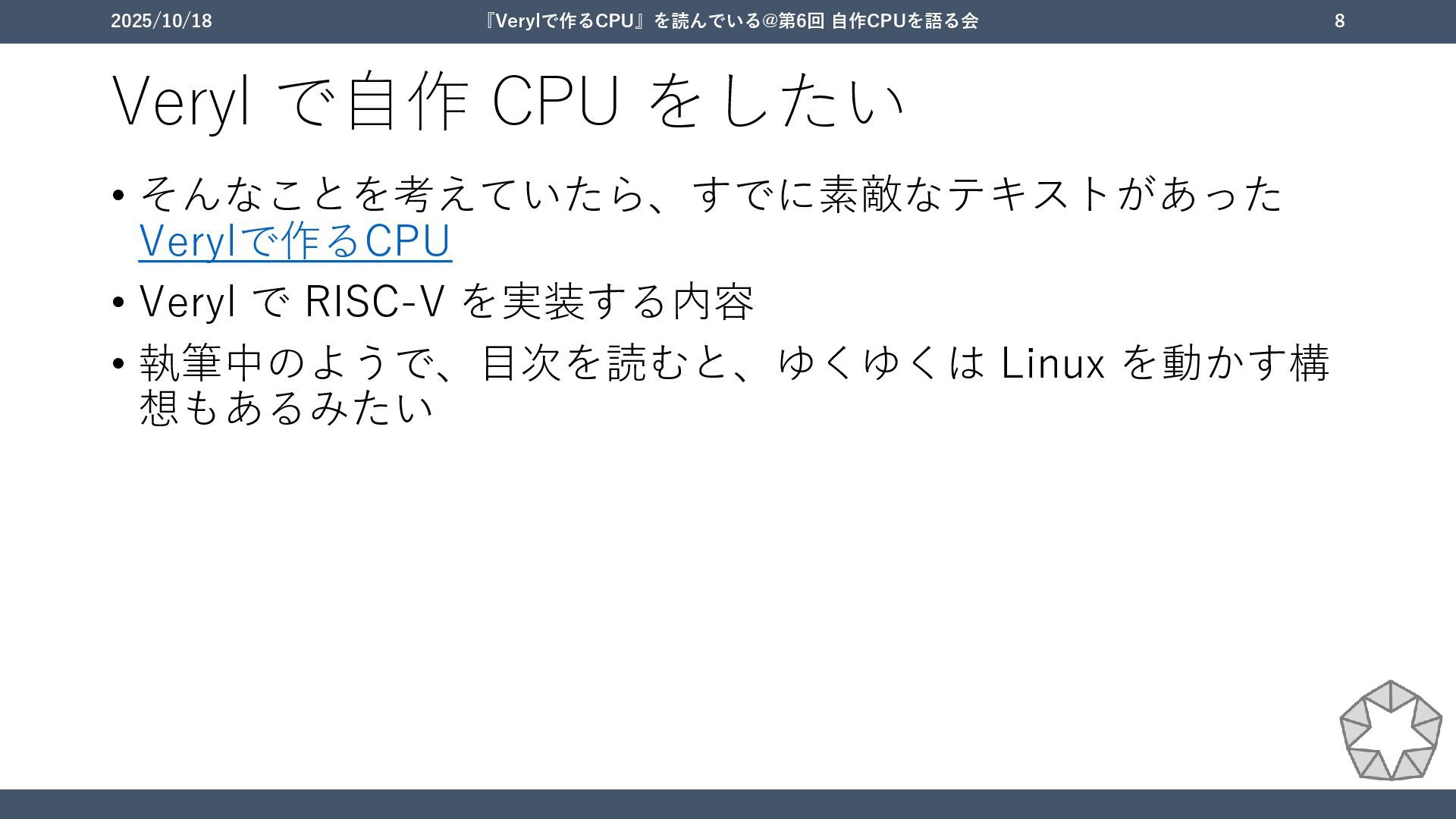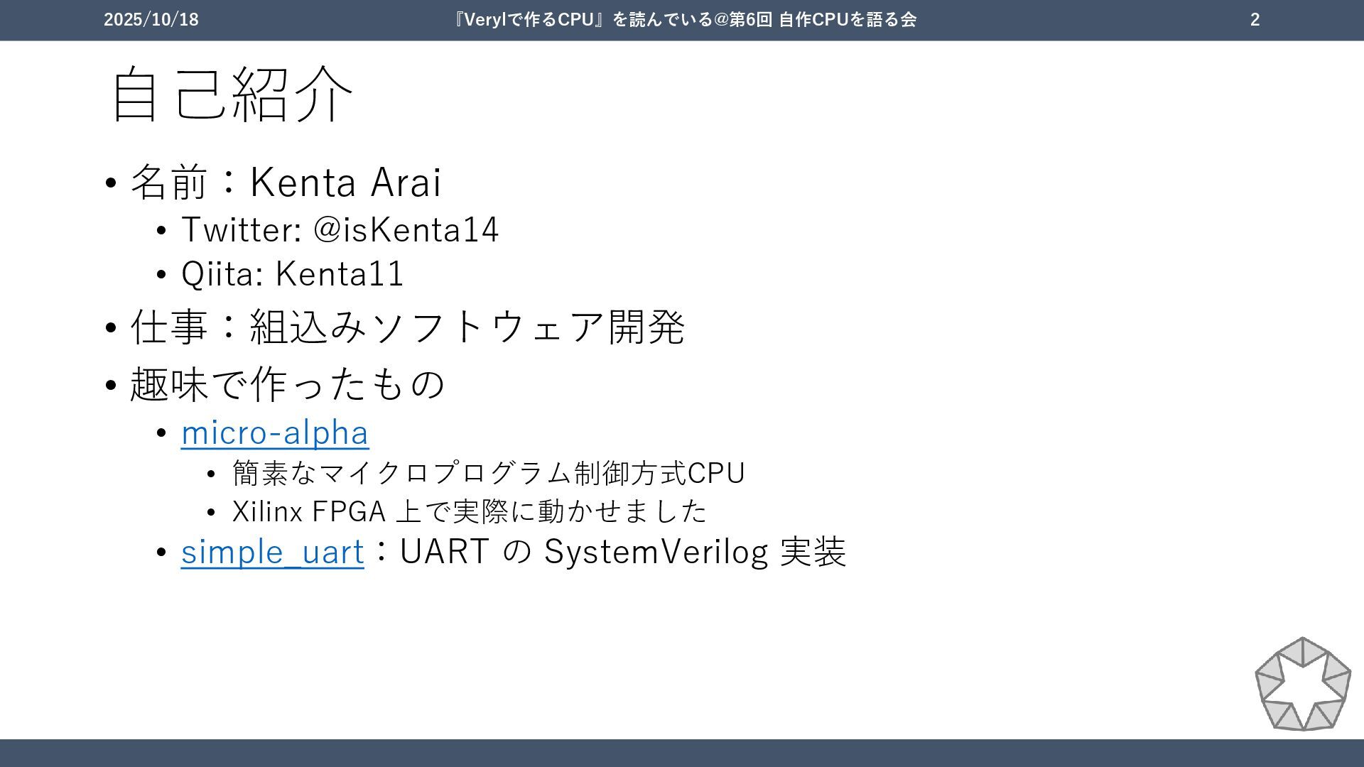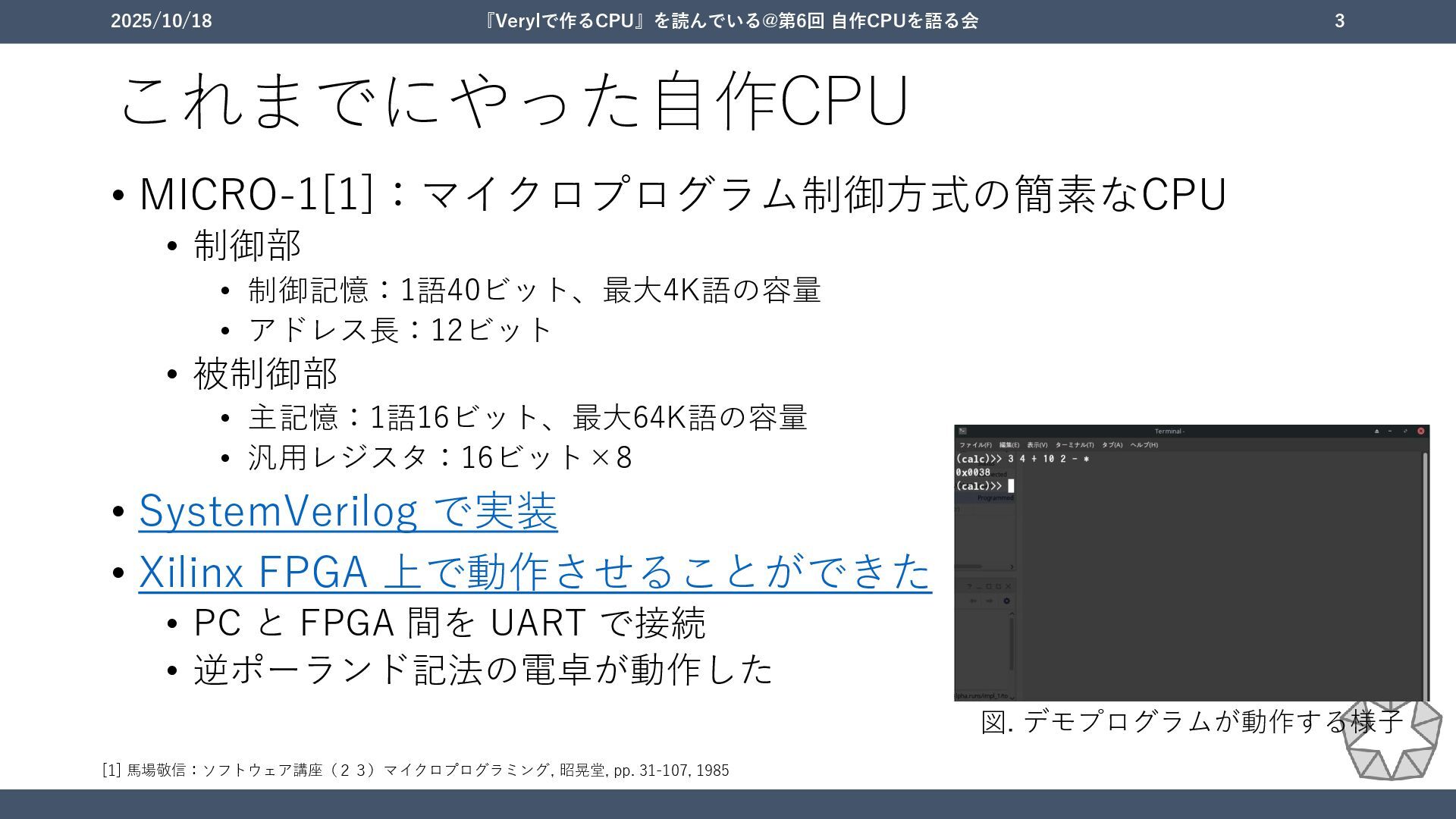 被制御部 • 主記憶:1語16ビット、最大64K語の容量 • 汎用レジスタ:16ビット×8 • SystemVerilog で実装 • Xilinx FPGA 上で動作させることができた • PC と FPGA 間を UART で接続 • 逆ポーランド記法の電卓が動作した 2025/10/18 『Verylで作るCPU』を読んでいる@第6回 自作CPUを語る会 3 [1] 馬場敬信:ソフトウェア講座(23)マイクロプログラミング, 昭晃堂, pp. 31-107, 1985 図. デモプログラムが動作する様子
