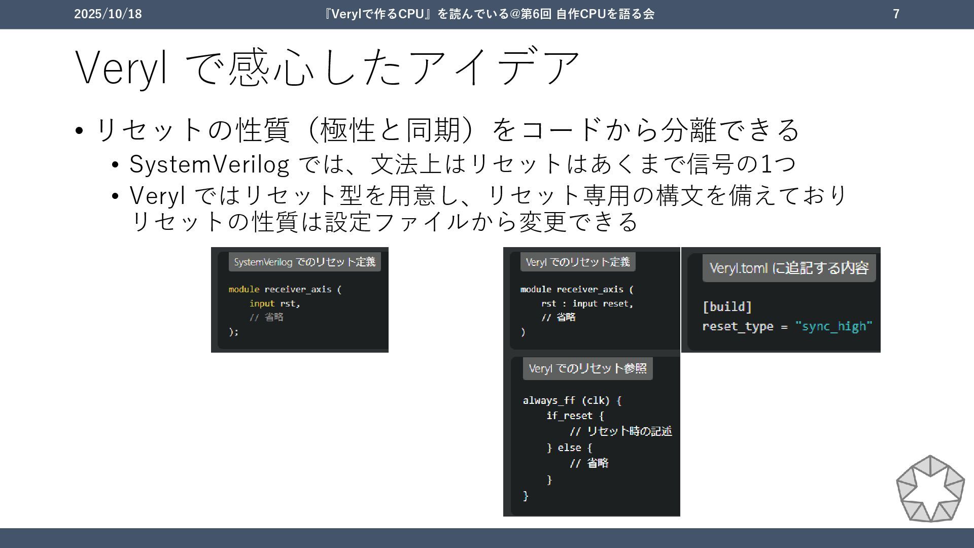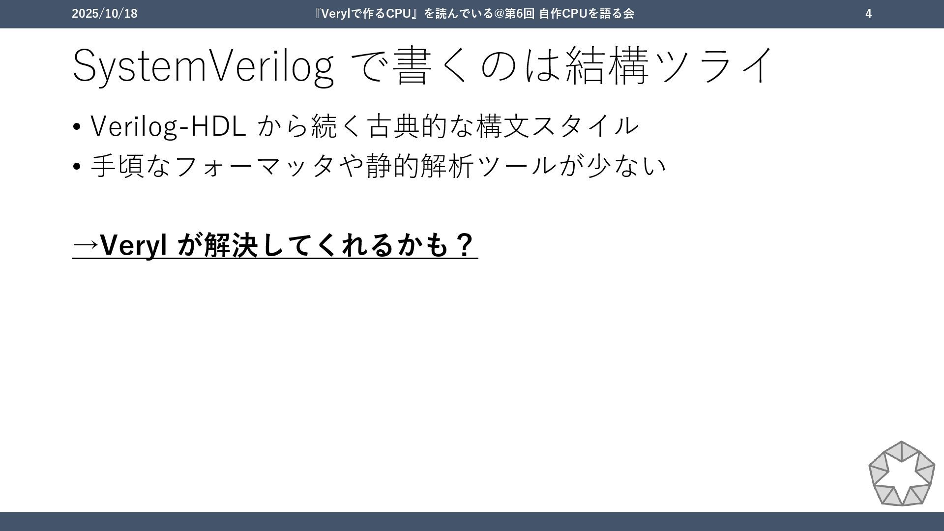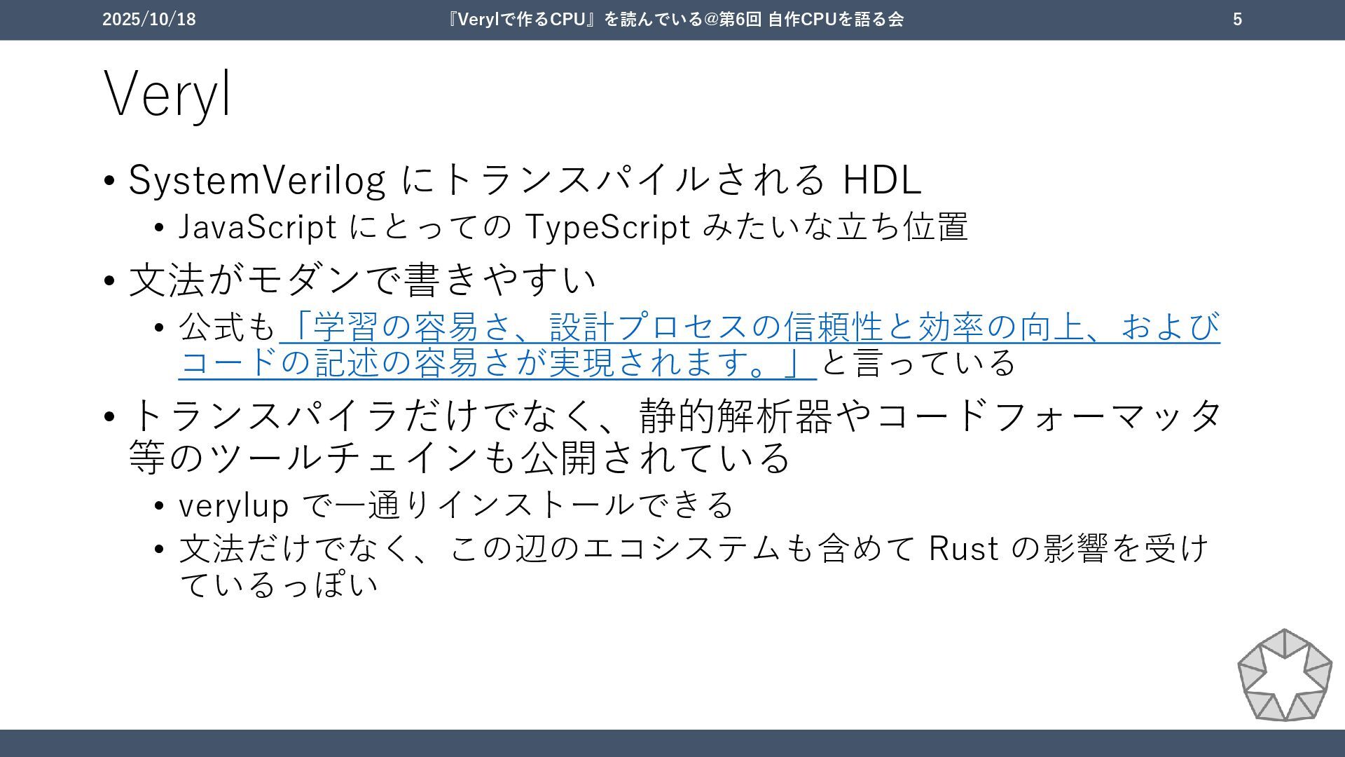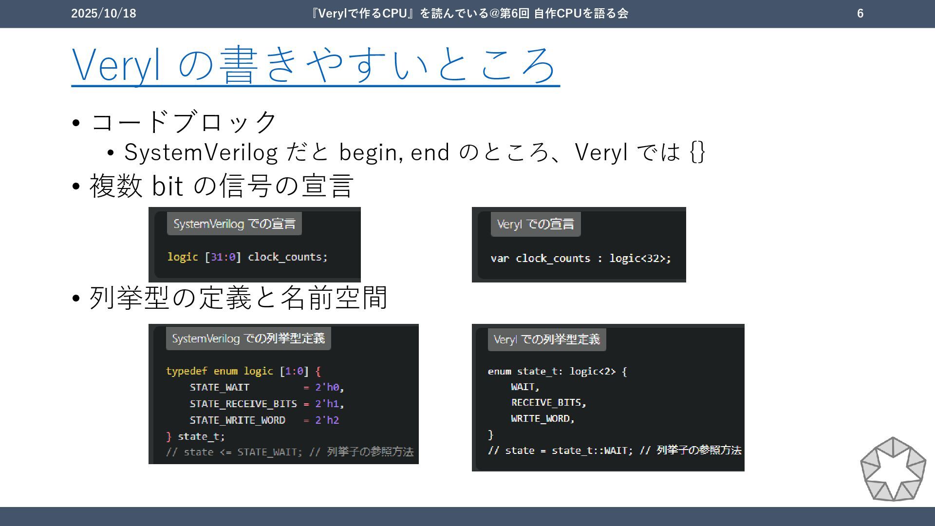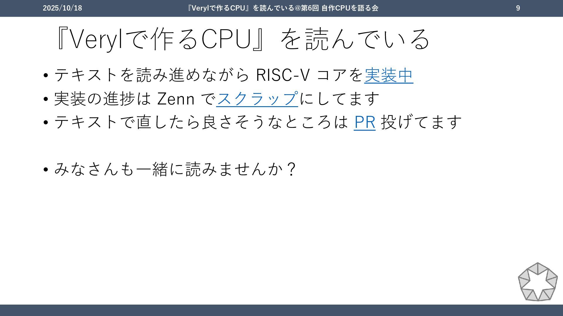 被制御部 • 主記憶:1語16ビット、最大64K語の容量 • 汎用レジスタ:16ビット×8 • SystemVerilog で実装 • Xilinx FPGA 上で動作させることができた • PC と FPGA 間を UART で接続 • 逆ポーランド記法の電卓が動作した 2025/10/18 『Verylで作るCPU』を読んでいる@第6回 自作CPUを語る会 3 [1] 馬場敬信:ソフトウェア講座(23)マイクロプログラミング, 昭晃堂, pp. 31-107, 1985 図. デモプログラムが動作する様子