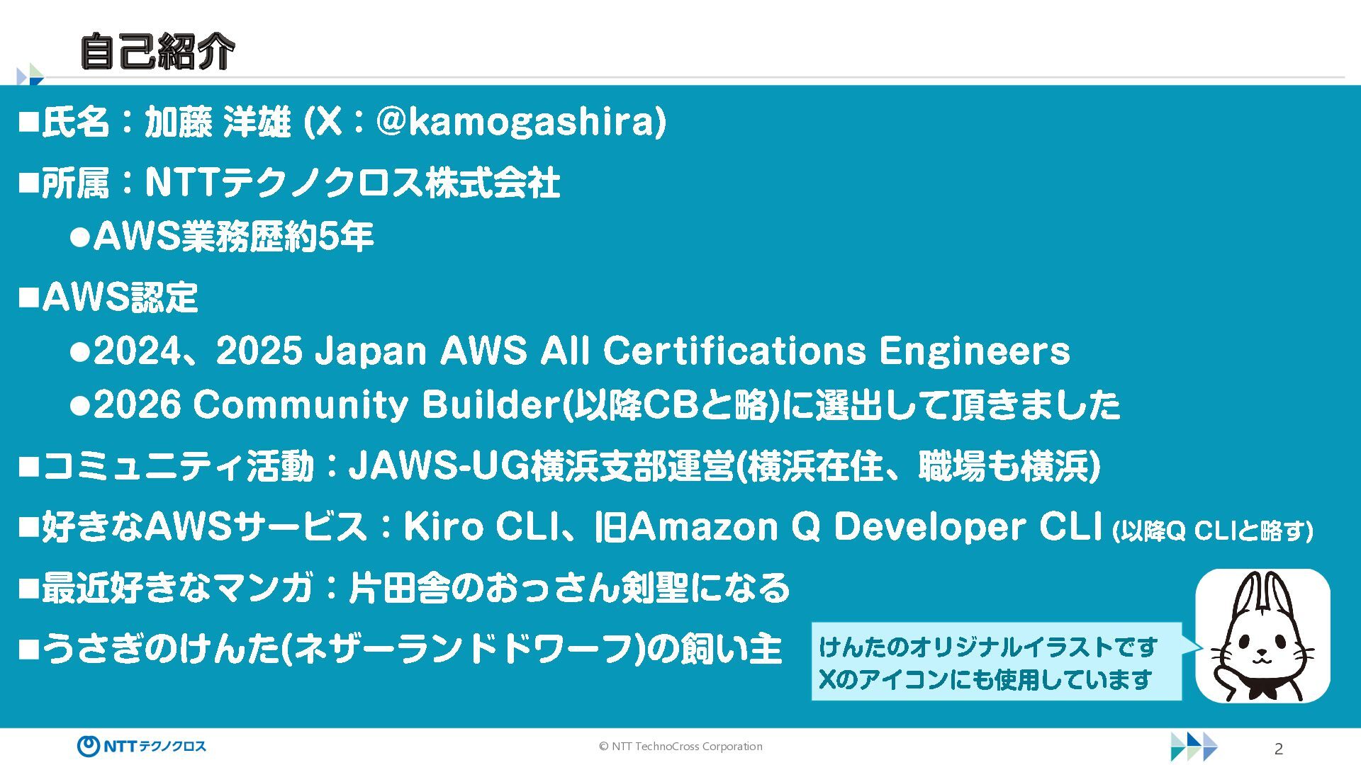 @kamogashira) ◼所属: NTT テクノクロス株式会社 ⚫AWS 業務歴約5年 ◼AWS 認定 ⚫2024 、 2025 Japan AWS All Certifications Engineers ⚫2026 Community Builder( 以降CB と略 )に選出して頂きました ◼コミュニティ活動: JAWS -UG 横浜支部運営(横浜在住、職場も横浜 ) ◼好きな AWS サービス: Kiro CLI 、 旧Amazon Q Developer CLI (以降Q CLI と略す ) ◼最近好きなマンガ:片田舎のおっさん剣聖になる ◼うさぎのけんた (ネザーランドドワーフ )の飼い主 けんたのオリジナルイラストです X のアイコンにも使用しています