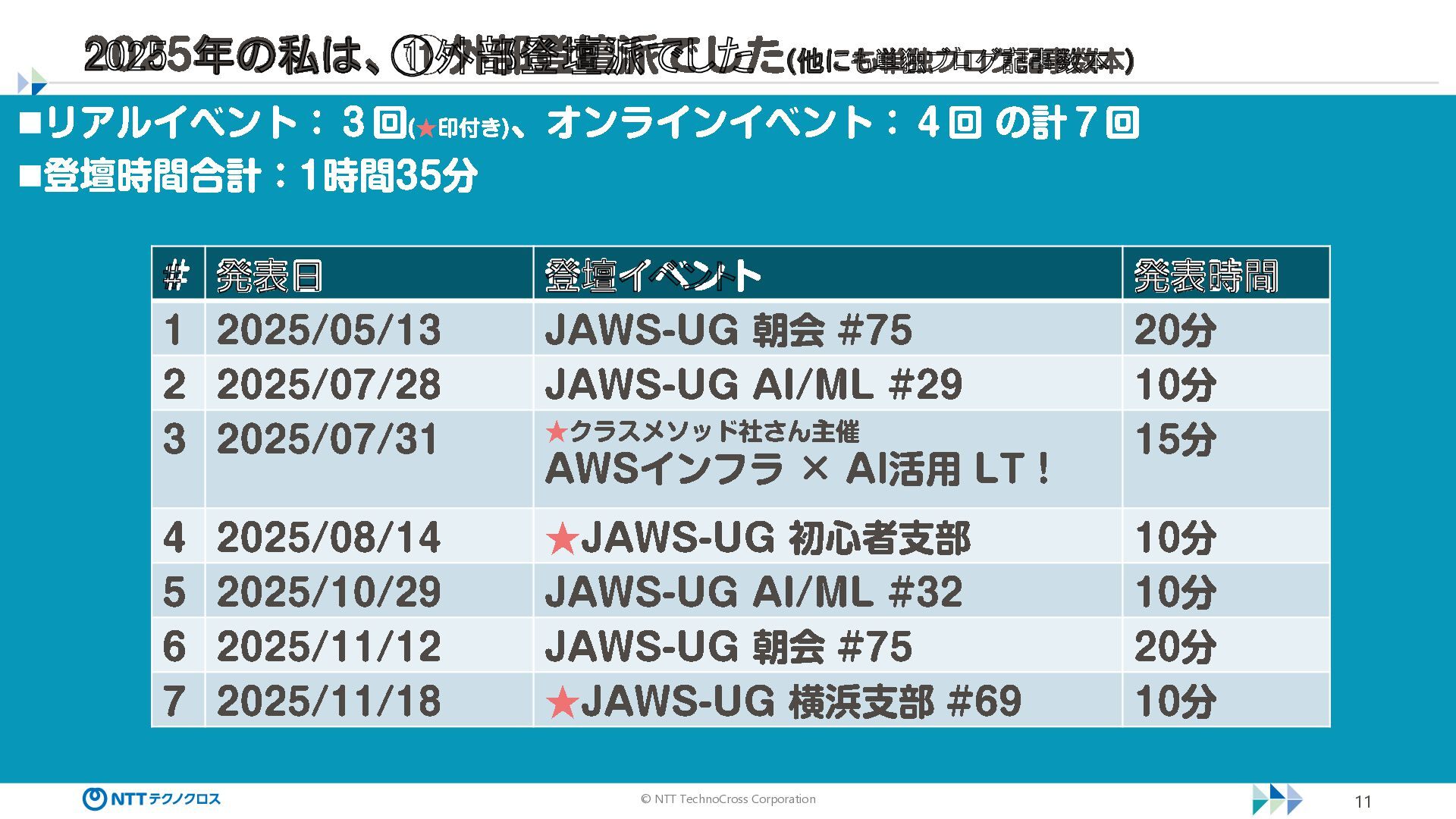 © NTT TechnoCross Corporation 11 2025 年の私は、①外部登壇派でした (他にも単独ブログ記事数本 ) ◼リアルイベント:3回