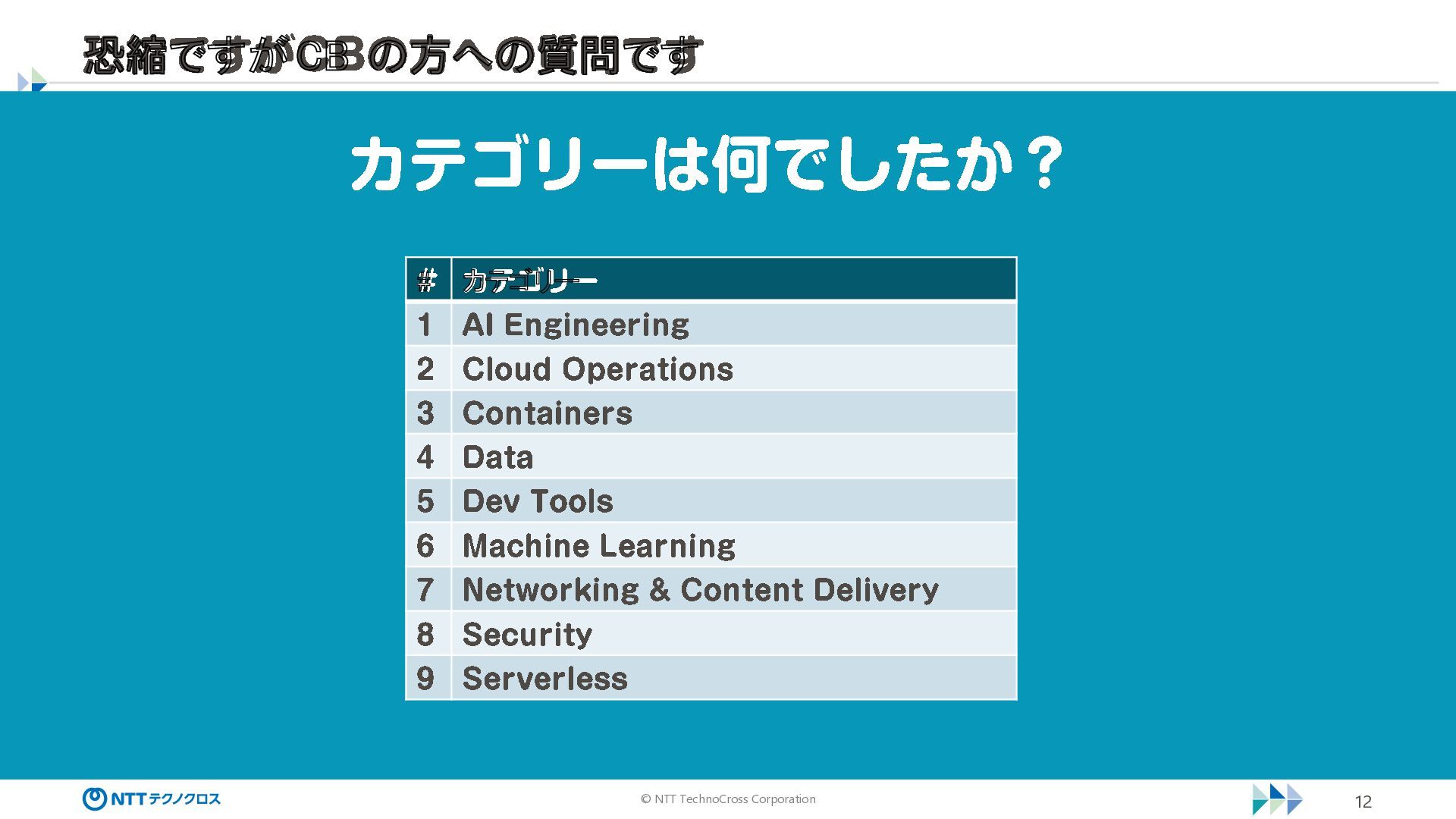 © NTT TechnoCross Corporation 12 カテゴリーは何でしたか? # カテゴリー 1 AI