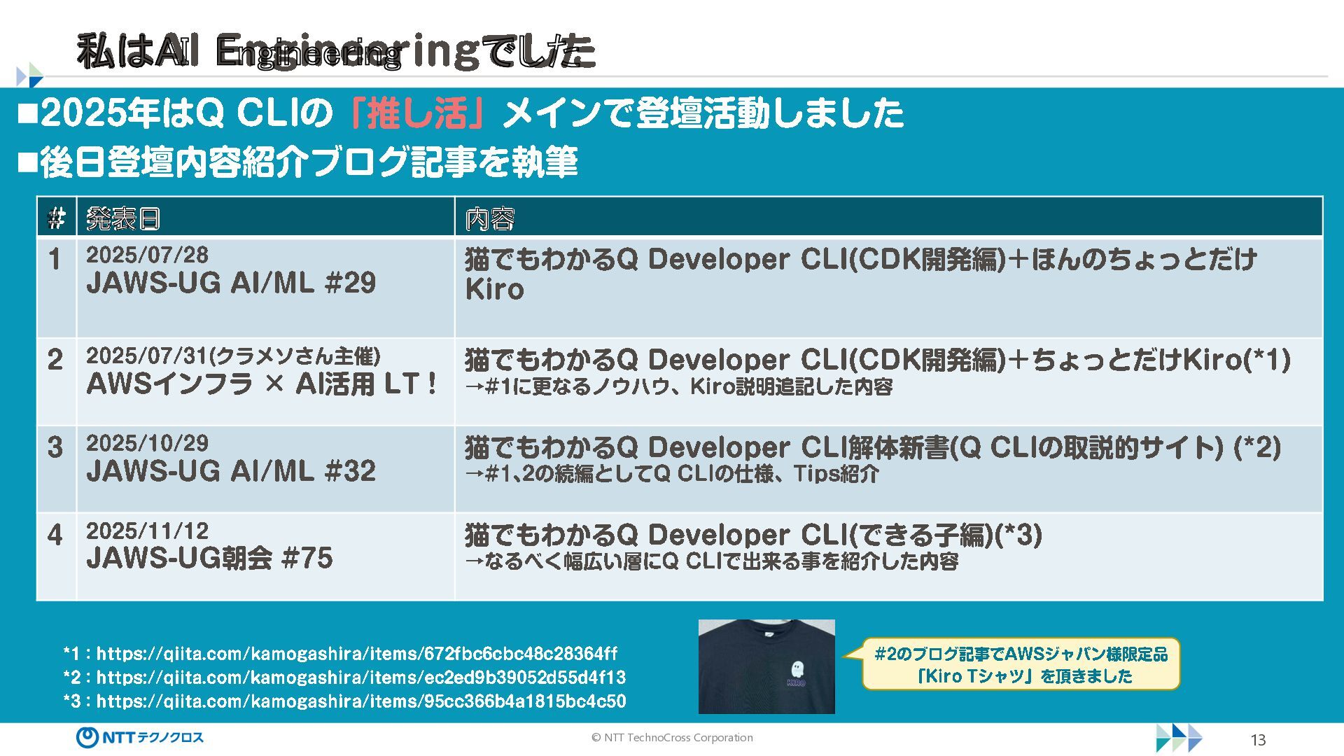 CLI の「推し活」 メインで登壇活動しました ◼後日登壇内容紹介ブログ記事を執筆 # 発表日 内容 1 2025/07/28 JAWS -UG AI/ML #29 猫でもわかる Q Developer CLI(CDK 開発編)+ほんのちょっとだけ Kiro 2 2025/07/31( クラメソさん主催 ) AWS インフラ × AI 活用 LT ! 猫でもわかる Q Developer CLI(CDK 開発編)+ちょっとだけ Kiro( *1) →#1 に更なるノウハウ、 Kiro 説明追記した内容 3 2025/10/29 JAWS -UG AI/ML #32 猫でもわかる Q Developer CLI 解体新書(Q CLI の取説的サイト ) ( *2) →#1 、2の続編として Q CLI の仕様、 Tips 紹介 4 2025/11/12 JAWS -UG 朝会 #75 猫でもわかる Q Developer CLI( できる子編 )( *3) →なるべく幅広い層に Q CLI で出来る事を紹介した内容 *1 : https ://qiita .com/kamogashira/items/ 672 fbc 6cbc 48 c 28364 ff *2 : https ://qiita .com/kamogashira/items/ec 2ed 9 b 39052 d 55 d 4 f 13 *3 : https ://qiita .com/kamogashira/items/ 95 cc 366 b 4 a 1815 bc 4 c50 #2 のブログ記事で AWS ジャパン様限定品 「 Kiro Tシャツ」を頂きました