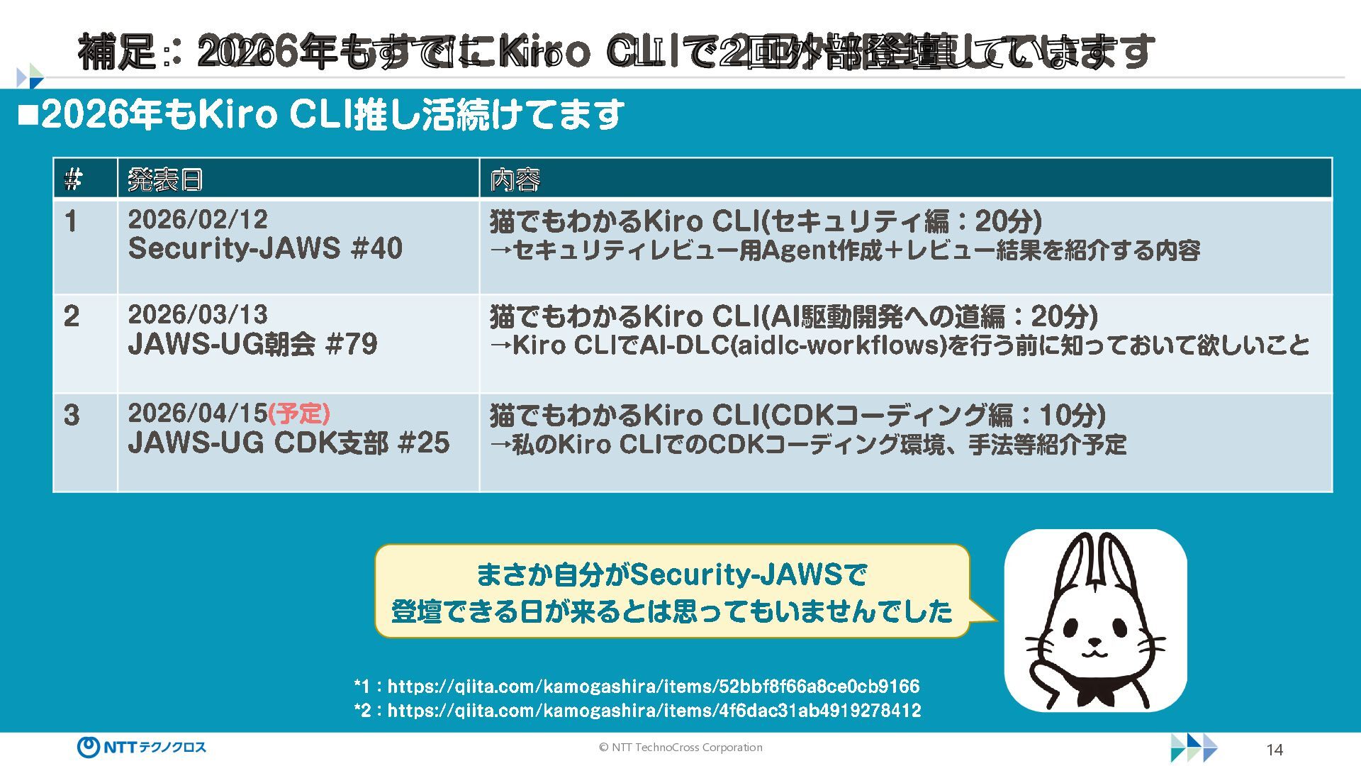 で2回外部登壇しています ◼2026 年も Kiro CLI 推し活続けてます # 発表日 内容 1 2026/02/12 Security -JAWS #40 猫でもわかる Kiro CLI( セキュリティ編: 20 分) →セキュリティレビュー用 Agent 作成+レビュー結果を紹介する内容 2 2026/03/13 JAWS -UG 朝会 #79 猫でもわかる Kiro CLI(AI 駆動開発への道編: 20 分) →Kiro CLI でAI -DLC( aidlc -workflows) を行う前に知っておいて欲しいこと 3 2026/04/15 (予定) JAWS -UG CDK 支部 #25 猫でもわかる Kiro CLI(CDK コーディング編: 10 分) →私のKiro CLI でのCDK コーディング環境、手法等紹介予定 *1 : https ://qiita .com/kamogashira/items/ 52 bbf 8 f 66 a 8ce 0cb 9166 *2 : https ://qiita .com/kamogashira/items/ 4f 6dac 31 ab 4919278412 まさか自分が Security -JAWS で 登壇できる日が来るとは思ってもいませんでした