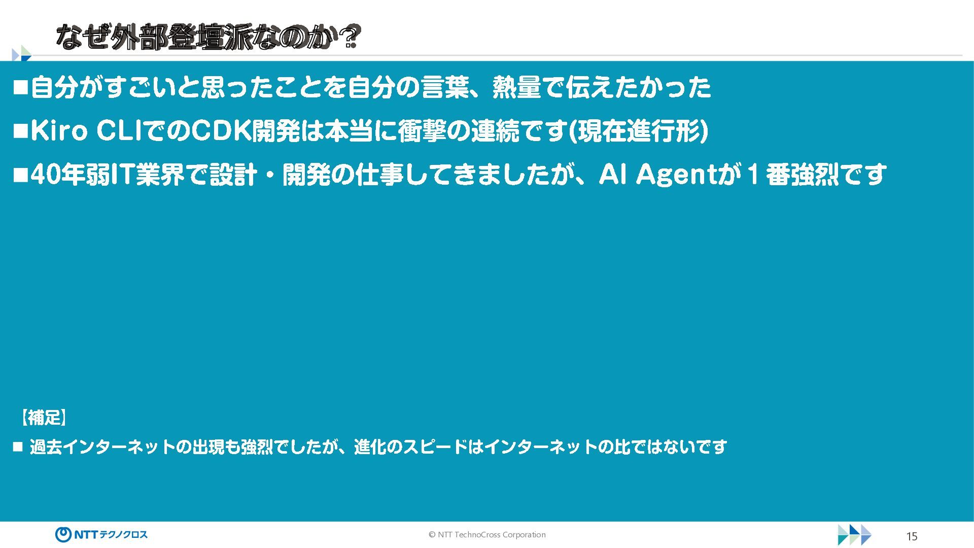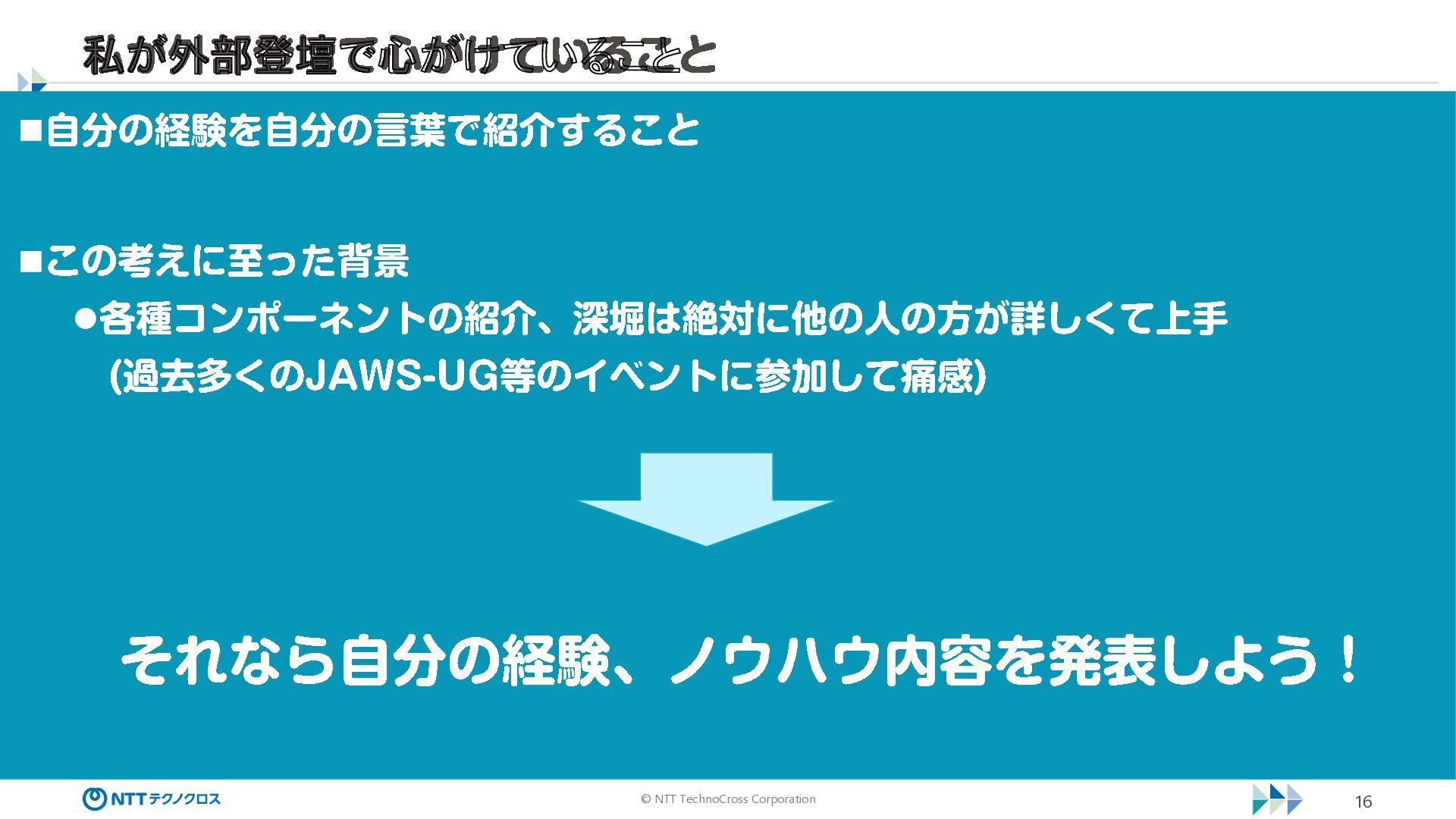 © NTT TechnoCross Corporation 15 なぜ外部登壇派なのか? ◼自分がすごいと思ったことを自分の言葉 、 熱量で伝えたかった ◼Kiro