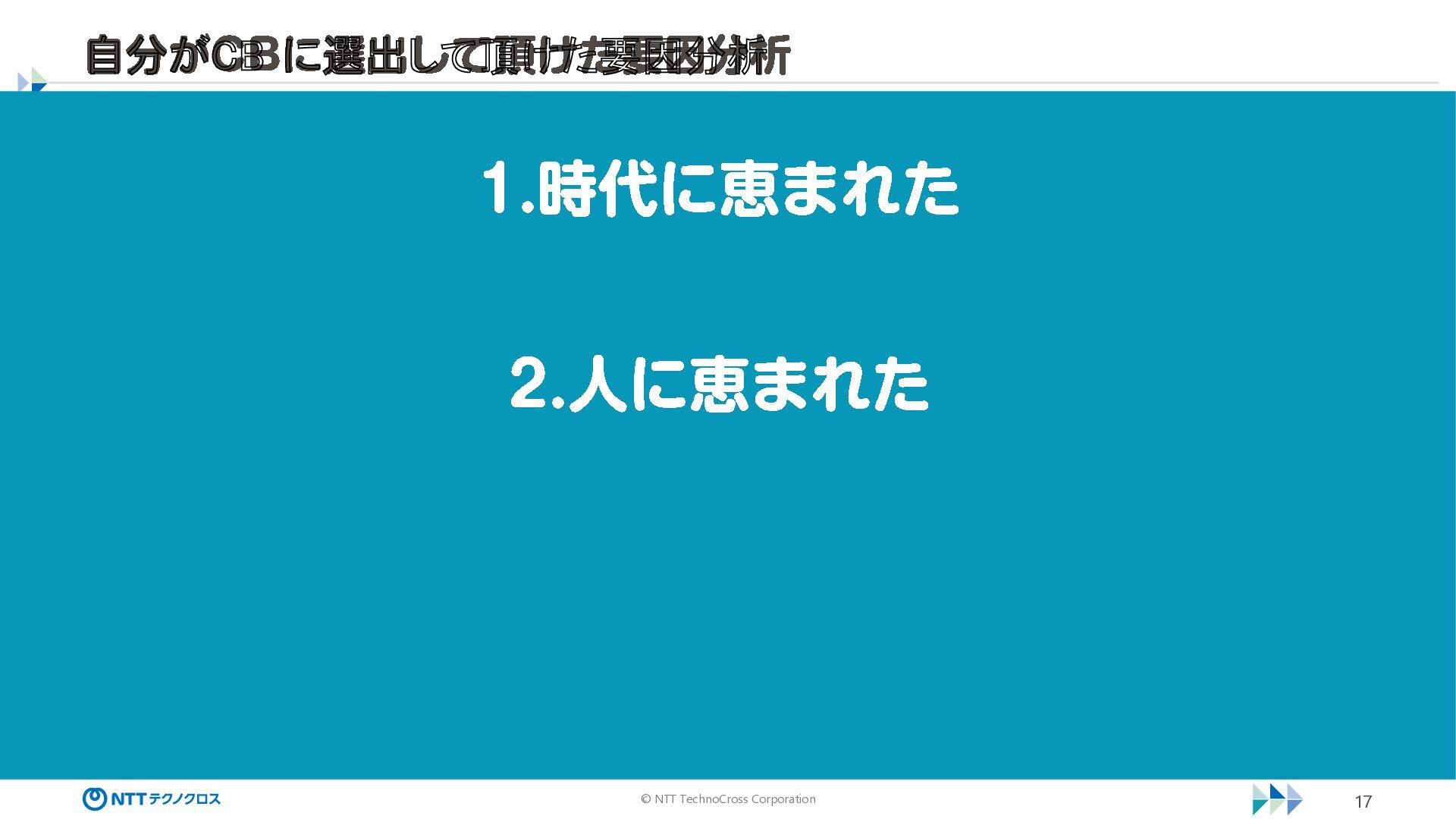 © NTT TechnoCross Corporation 17 自分がCB に選出して頂けた要因分析 1. 時代に恵まれた 2.