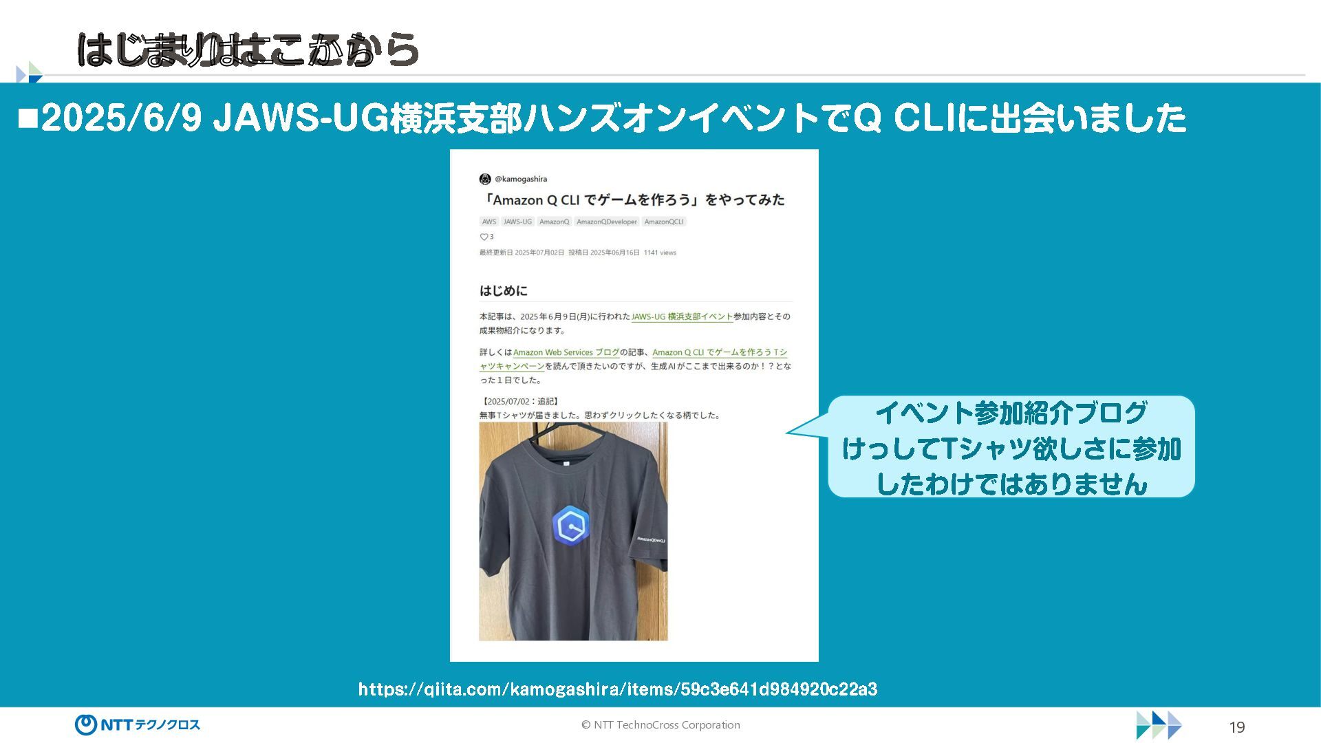 横浜支部ハンズオンイベントで Q CLI に出会いました https ://qiita .com/kamogashira/items/ 59 c3e 641 d 984920 c22 a 3 イベント参加紹介ブログ けっして Tシャツ欲しさに参加 したわけではありません