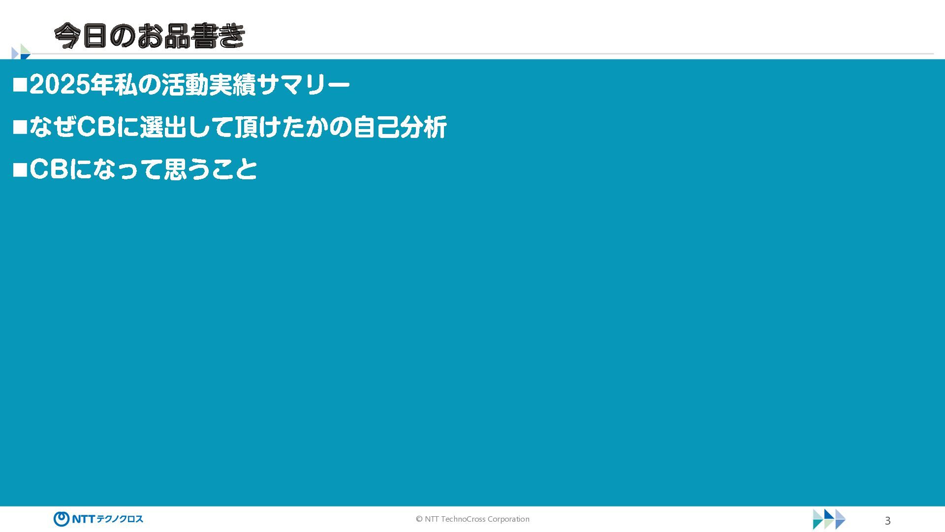 © NTT TechnoCross Corporation 3 ◼2025 年私の活動実績サマリー ◼なぜCB に選出して頂けたかの自己分析 ◼CB