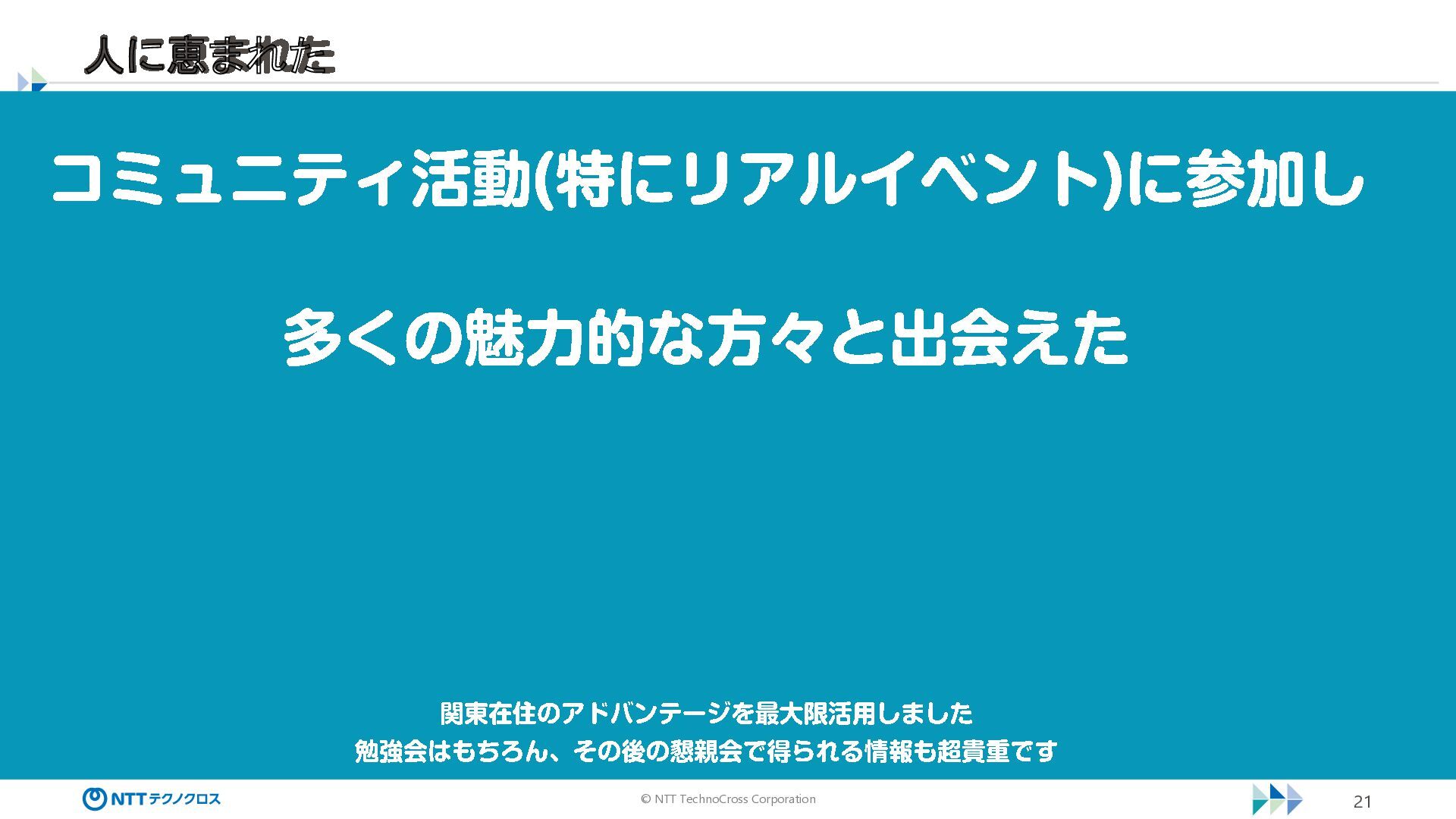 © NTT TechnoCross Corporation 21 コミュニティ活動 (特にリアルイベント )に参加し 多くの魅力的な方々と出会えた 関東在住のアドバンテージを最大限活用しました