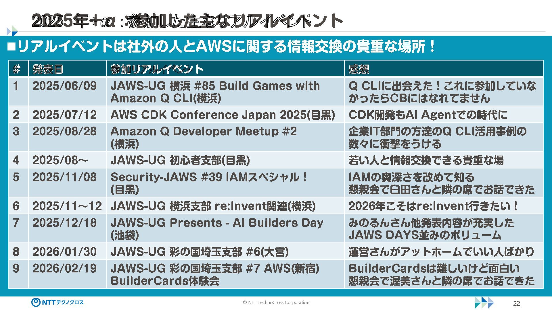 © NTT TechnoCross Corporation 22 2025 年+α :参加した主なリアルイベント ◼リアルイベントは社外の人と AWS