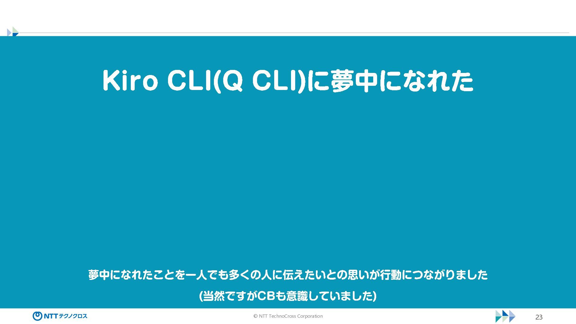 © NTT TechnoCross Corporation 23 Kiro CLI(Q CLI) に夢中になれた 夢中になれたことを一人でも多くの人に伝えたいとの思いが行動につながりました