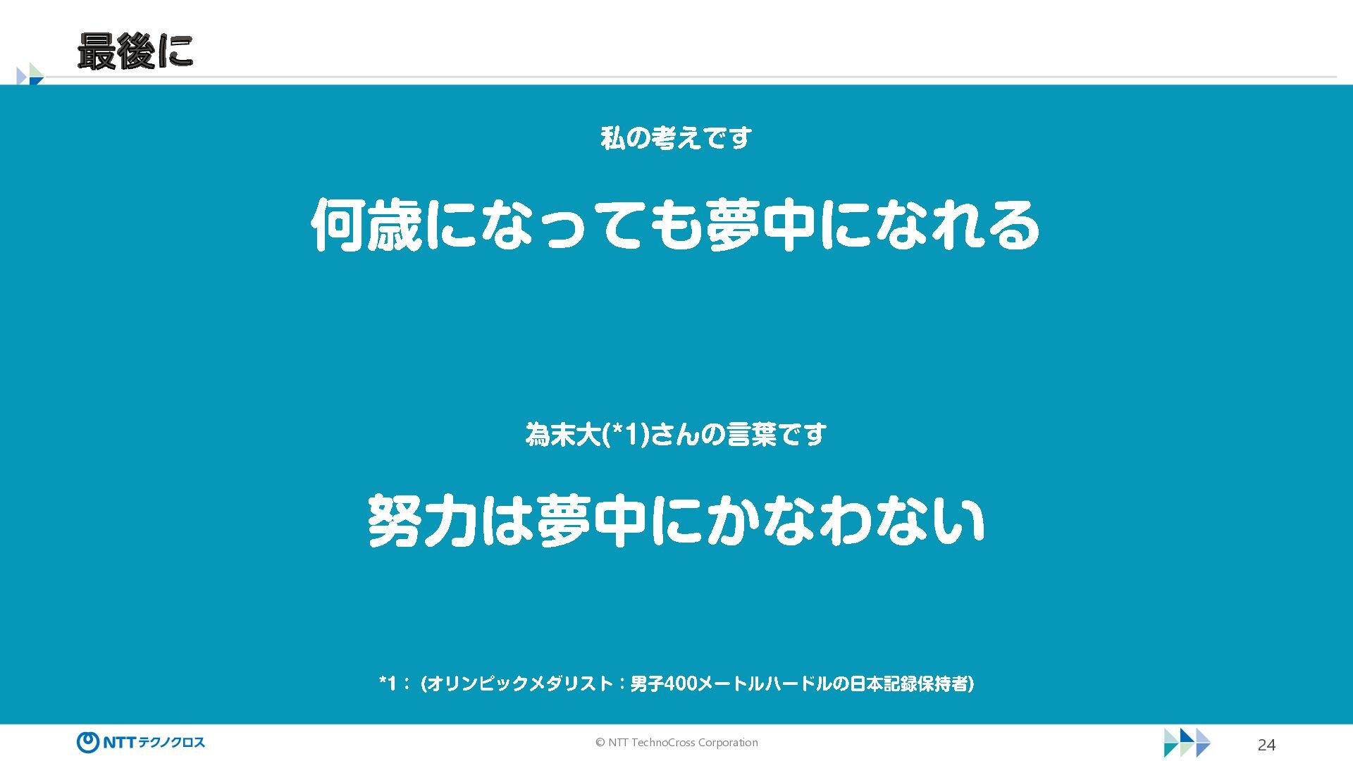 © NTT TechnoCross Corporation 24 私の考えです 何歳になっても夢中になれる 為末大(*1) さんの言葉です 努力は夢中にかなわない