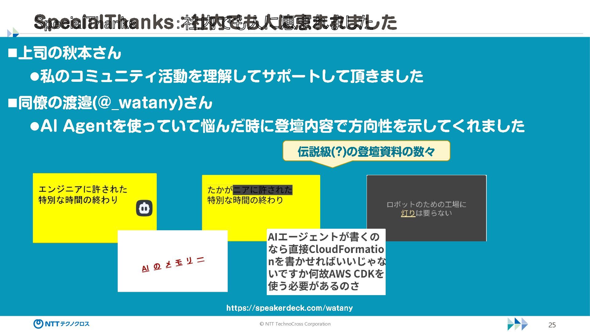 watany) さん ⚫AI Agent を使っていて悩んだ時に登壇内容で方向性を示してくれました 伝説級(?) の登壇資料の数々 https ://speakerdeck .com/watany