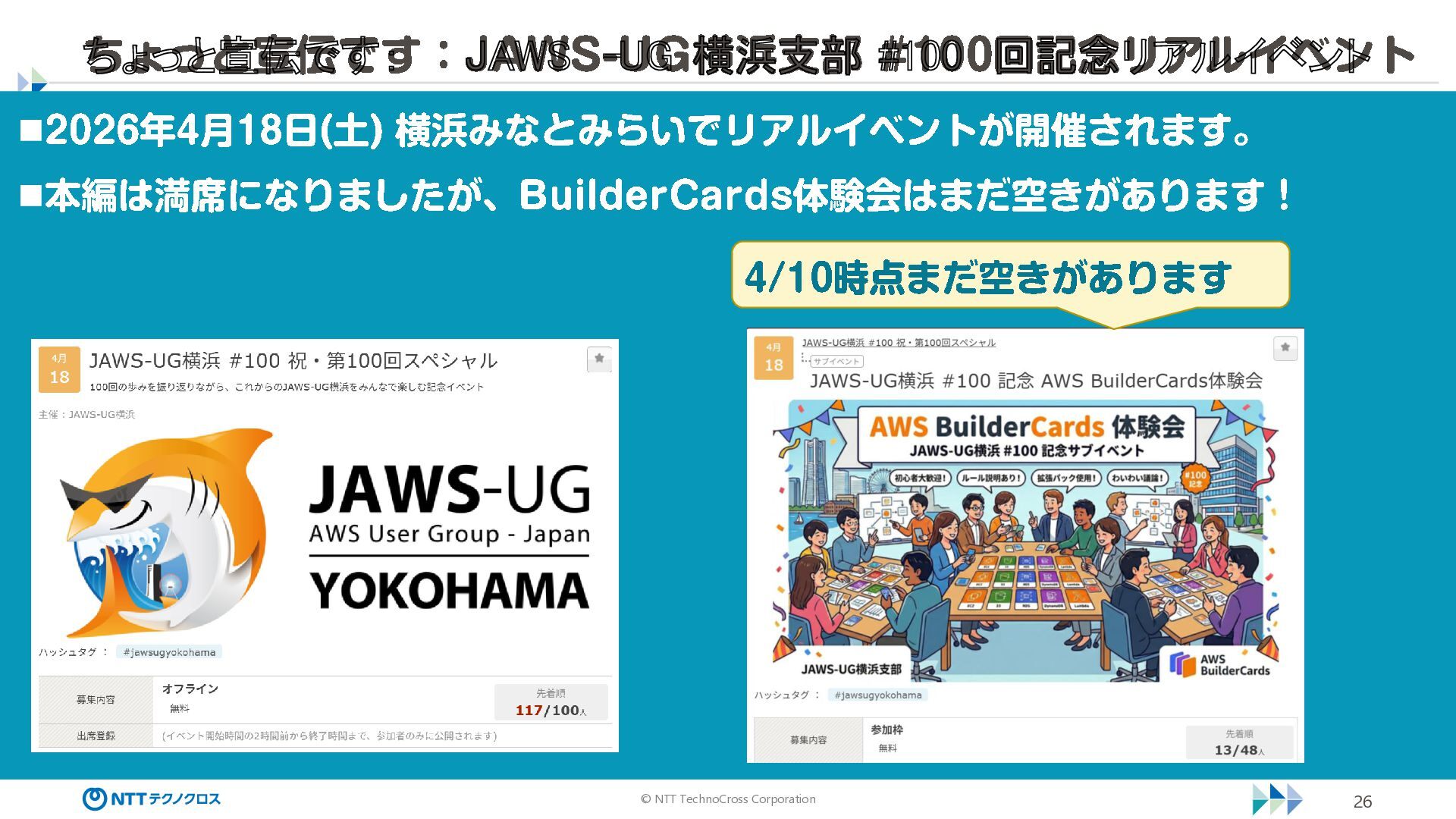 ◼本編は満席になりましたが 、 BuilderCards 体験会はまだ空きがあります ! ちょっと宣伝です: JAWS -UG 横浜支部 #100 回記念リアルイベント 4/10 時点まだ空きがあります