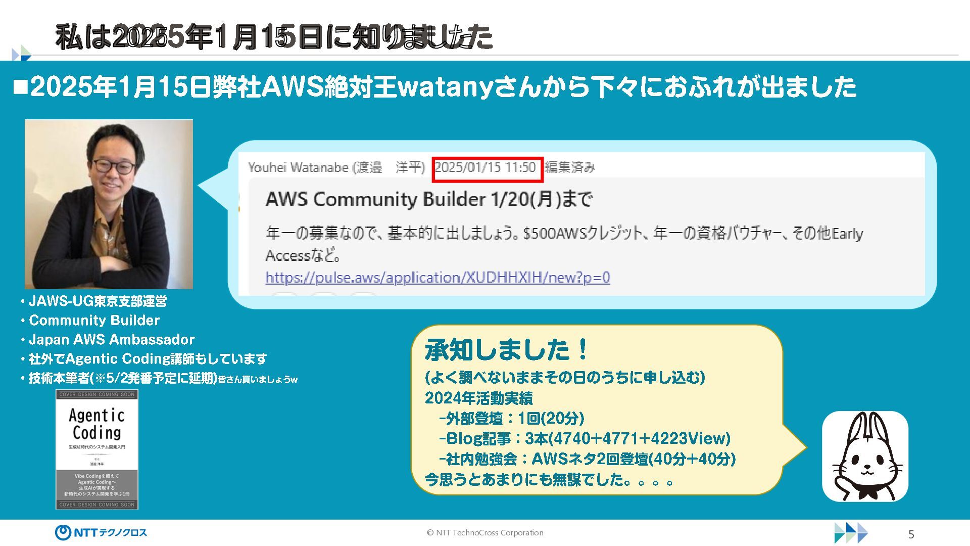 ) 2024 年活動実績 ー外部登壇: 1回(20 分) ーBlog 記事: 3本(4740+4771+4223View) ー社内勉強会: AWS ネタ 2回登壇(40 分+40 分) 今思うとあまりにも無謀でした。。。。 ◼2025 年1月15 日弊社AWS 絶対王watany さんから下々におふれが出ました ・ JAWS -UG 東京支部運営 ・ Community Builder ・ Japan AWS Ambassador ・ 社外でAgentic Coding 講師もしています ・ 技術本筆者(※5/2発番予定に延期)皆さん買いましょう w