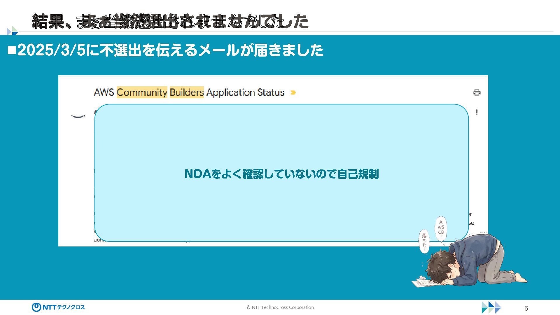 © NTT TechnoCross Corporation 6 結果、まぁ当然選出されませんでした ◼2025 /3/5に不選出を伝えるメールが届きました NDA をよく確認していないので自己規制
