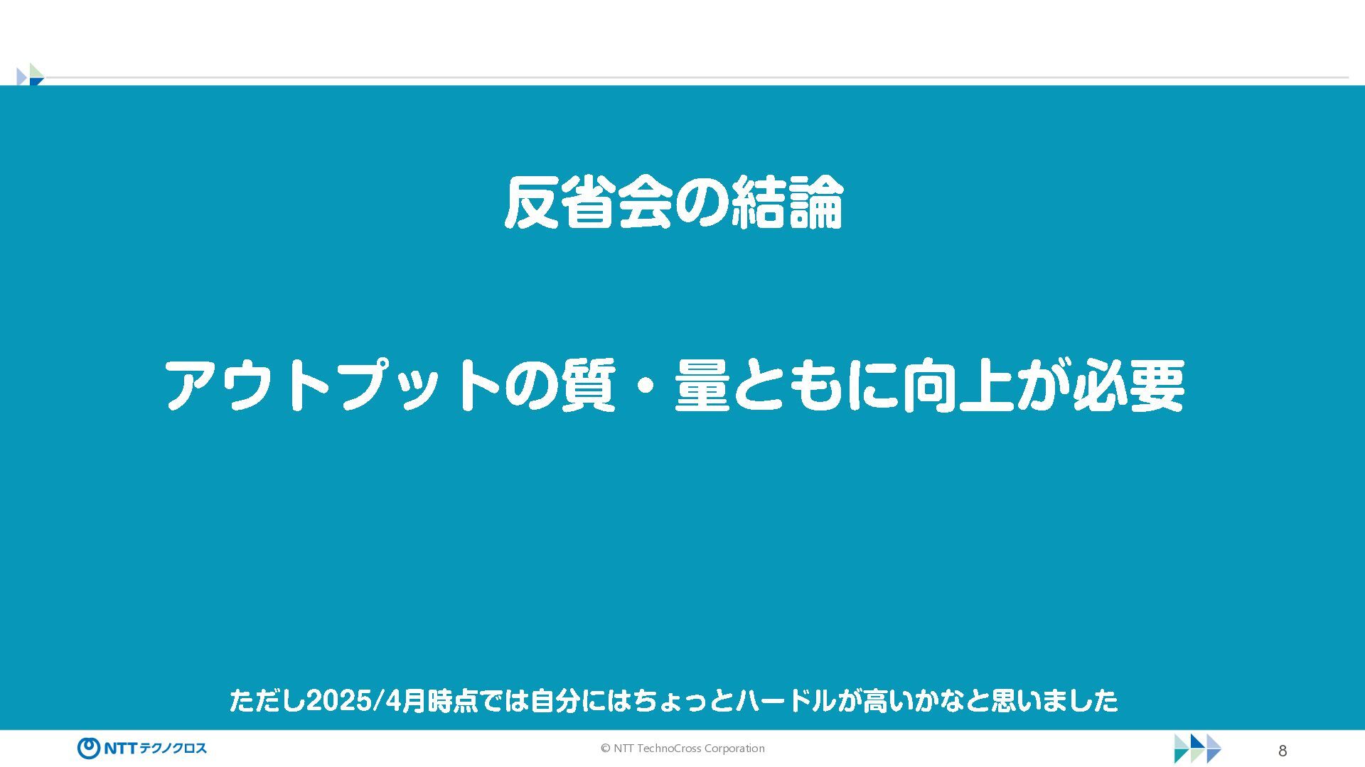 © NTT TechnoCross Corporation 8 反省会の結論 アウトプットの質・量ともに向上が必要 ただし 2025/4 月時点では自分にはちょっとハードルが高いかなと思いました