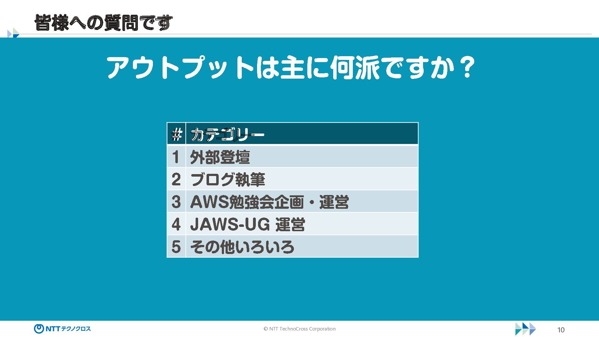 © NTT TechnoCross Corporation 10 アウトプットは主に何派ですか? 皆様への質問です # カテゴリー 1