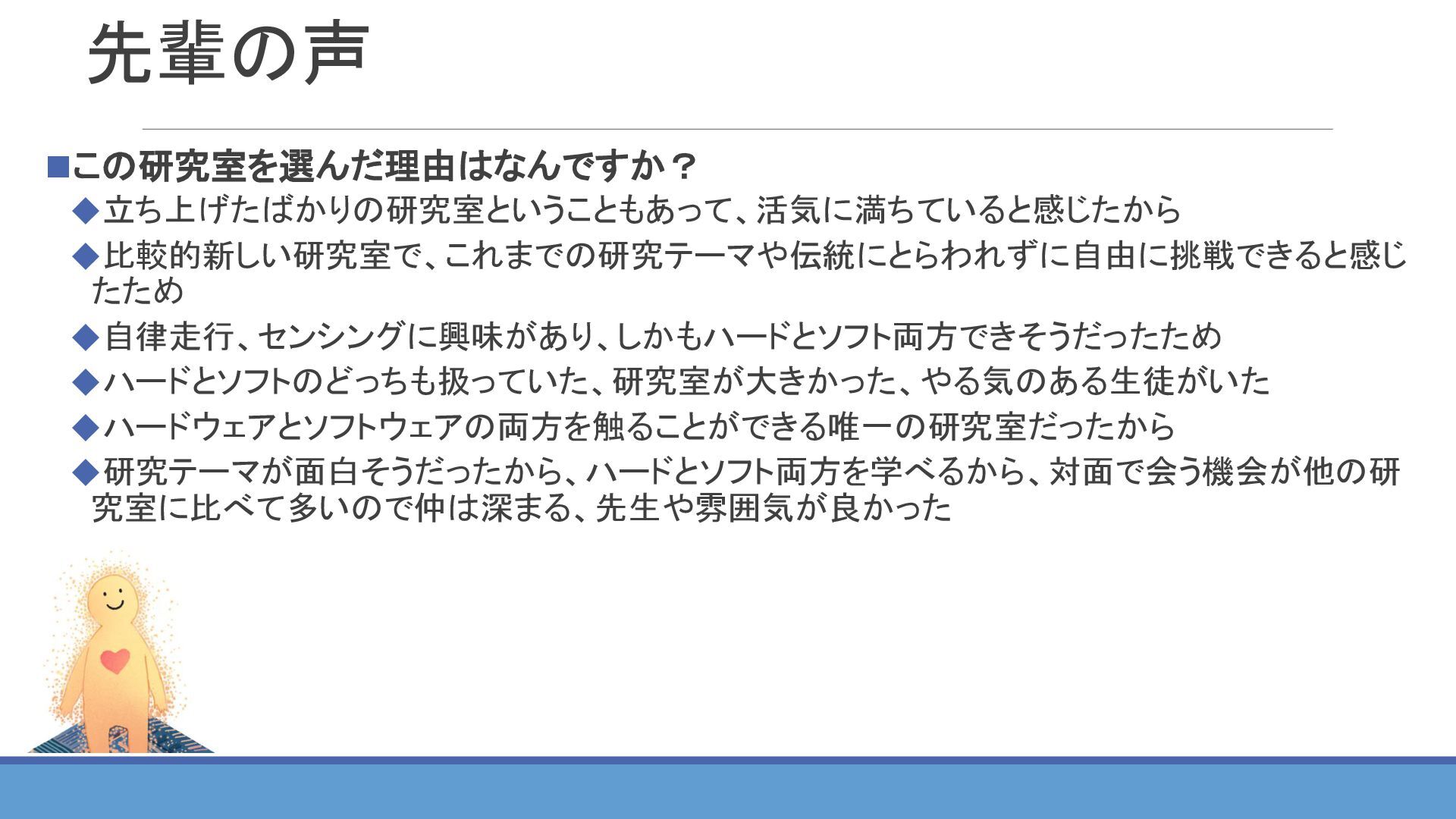 ◼この研究室を選んだ理由はなんですか? ◆立ち上げたばかりの研究室ということもあって、活気に満ちていると感じたから ◆比較的新しい研究室で、これまでの研究テーマや伝統にとらわれずに自由に挑戦できると感じ たため ◆自律走行、センシングに興味があり、しかもハードとソフト両方できそうだったため ◆ハードとソフトのどっちも扱っていた、研究室が大きかった、やる気のある生徒がいた ◆ハードウェアとソフトウェアの両方を触ることができる唯一の研究室だったから ◆研究テーマが面白そうだったから、ハードとソフト両方を学べるから、対面で会う機会が他の研 究室に比べて多いので仲は深まる、先生や雰囲気が良かった 先輩の声