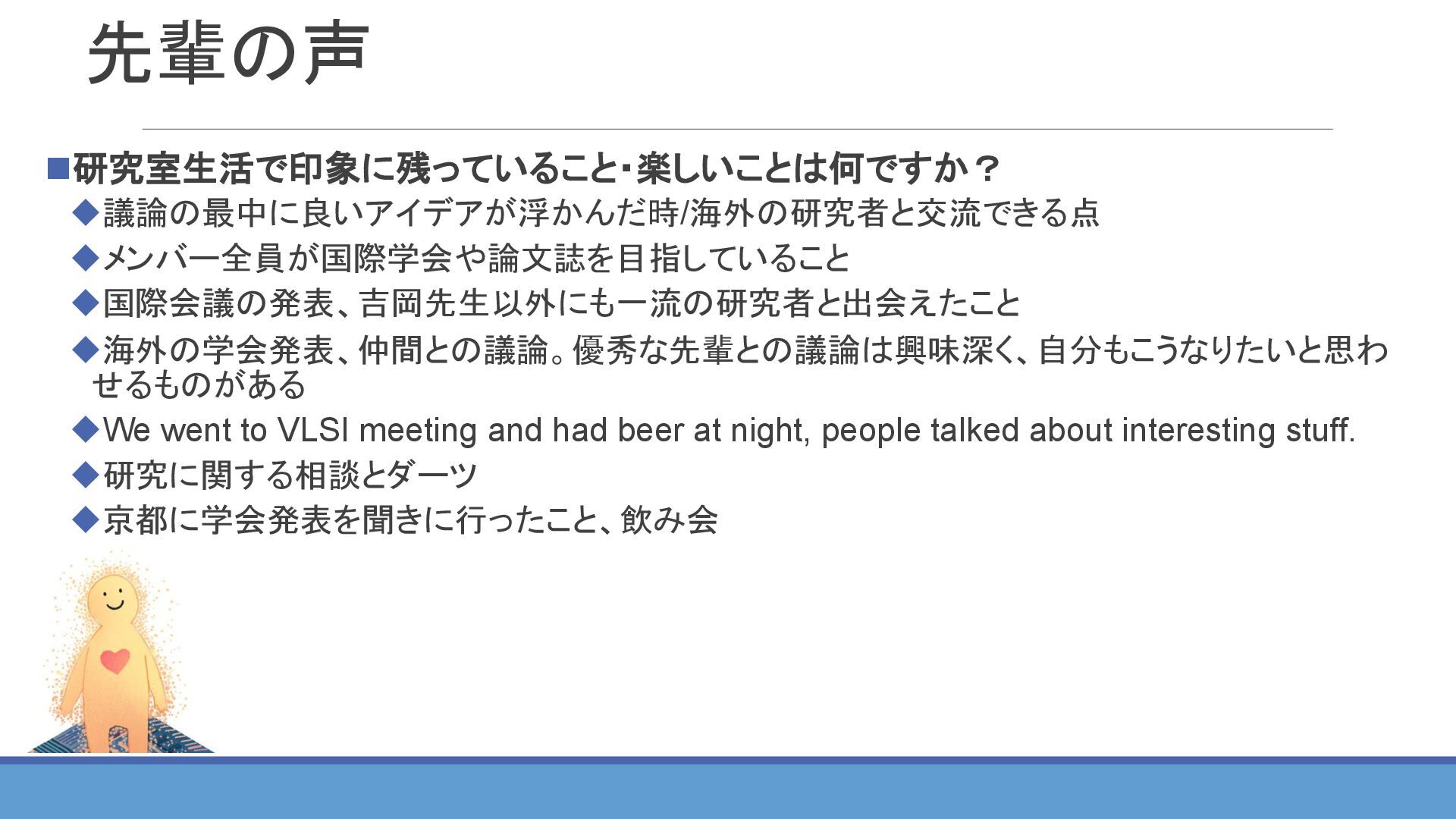 ◼研究室生活で印象に残っていること・楽しいことは何ですか? ◆議論の最中に良いアイデアが浮かんだ時/海外の研究者と交流できる点 ◆メンバー全員が国際学会や論文誌を目指していること ◆国際会議の発表、吉岡先生以外にも一流の研究者と出会えたこと ◆海外の学会発表、仲間との議論。優秀な先輩との議論は興味深く、自分もこうなりたいと思わ せるものがある ◆We went to VLSI