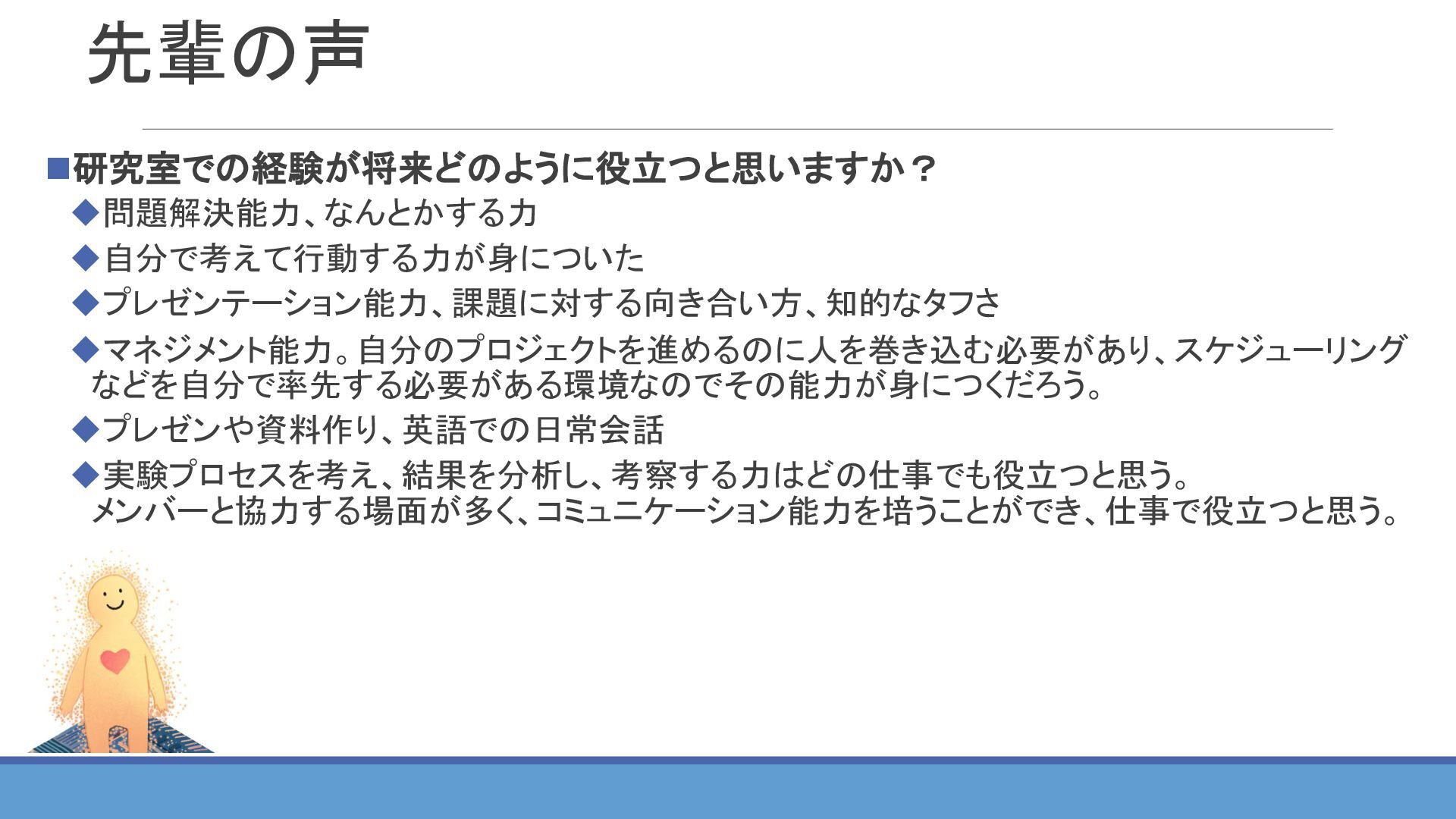 ◼研究室での経験が将来どのように役立つと思いますか? ◆問題解決能力、なんとかする力 ◆自分で考えて行動する力が身についた ◆プレゼンテーション能力、課題に対する向き合い方、知的なタフさ ◆マネジメント能力。自分のプロジェクトを進めるのに人を巻き込む必要があり、スケジューリング などを自分で率先する必要がある環境なのでその能力が身につくだろう。 ◆プレゼンや資料作り、英語での日常会話 ◆実験プロセスを考え、結果を分析し、考察する力はどの仕事でも役立つと思う。 メンバーと協力する場面が多く、コミュニケーション能力を培うことができ、仕事で役立つと思う。 先輩の声