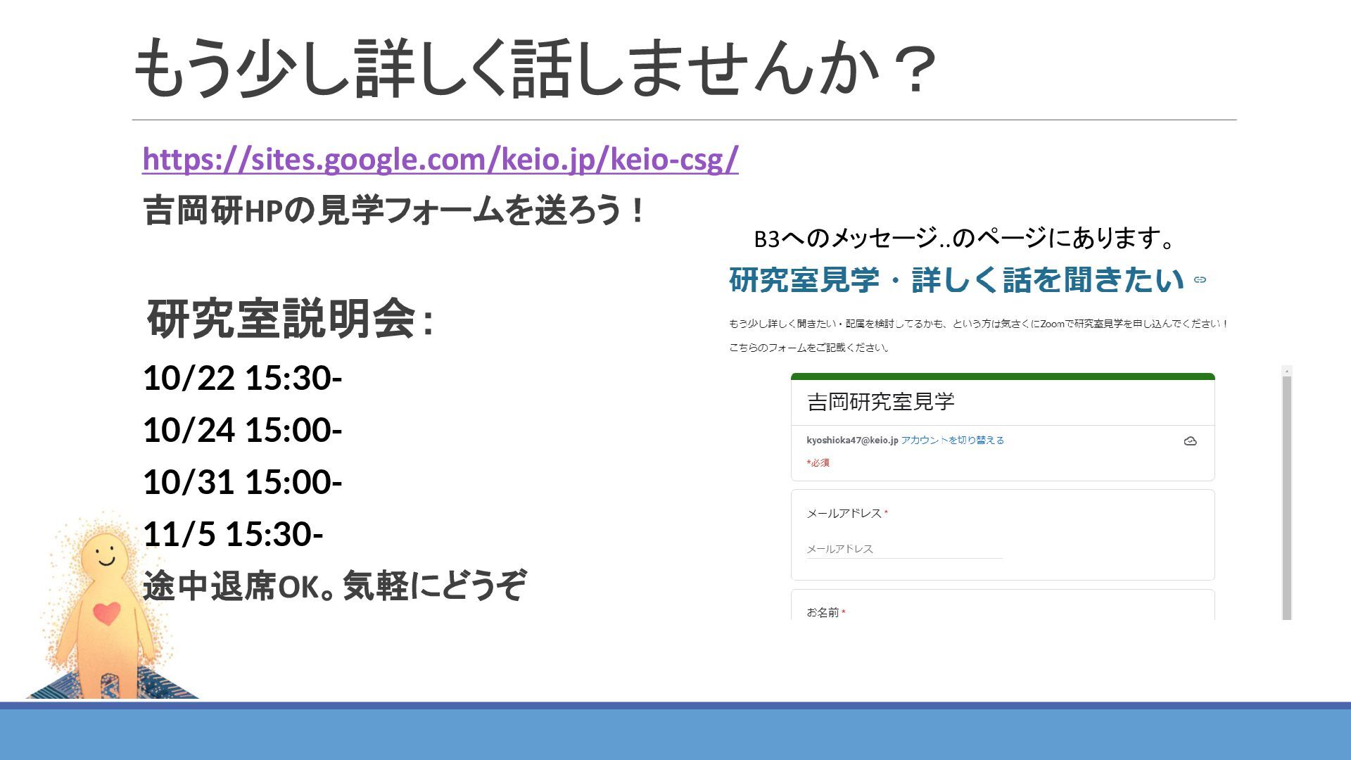 もう少し詳しく話しませんか? https://sites.google.com/keio.jp/keio-csg/ 吉岡研HPの見学フォームを送ろう! 研究室説明会: 10/22 15:30- 10/24 15:00- 10/31 15:00-