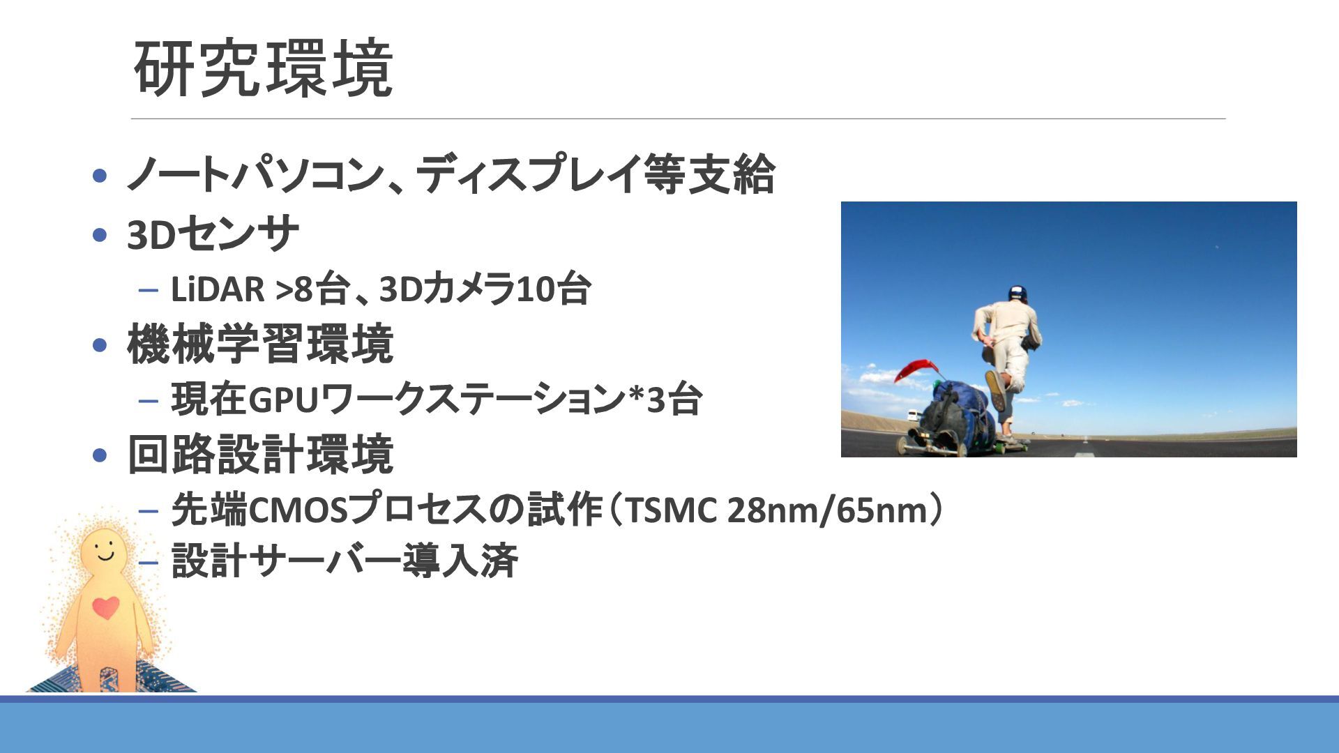 研究環境 • ノートパソコン、ディスプレイ等支給 • 3Dセンサ – LiDAR >8台、3Dカメラ10台 • 機械学習環境