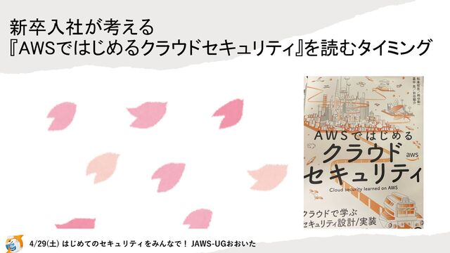 新卒入社が考える 『AWSではじめるクラウドセキュリティ』を読むタイミング 4/29(⼟) はじめてのセキュリティをみんなで! JAWS-UGおおいた