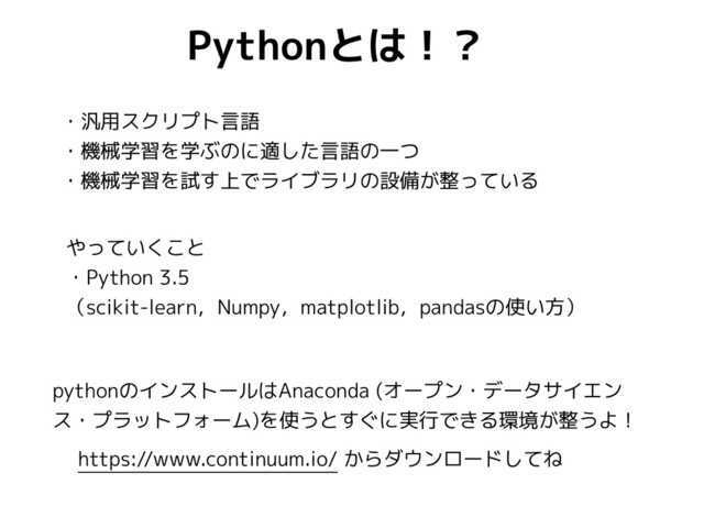 Pythonとは!? ・汎用スクリプト言語 ・機械学習を学ぶのに適した言語の一つ ・機械学習を試す上でライブラリの設備が整っている やっていくこと ・Python 3.5 (scikit-learn,Numpy,matplotlib,pandasの使い方) pythonのインストールはAnaconda (オープン・データサイエン