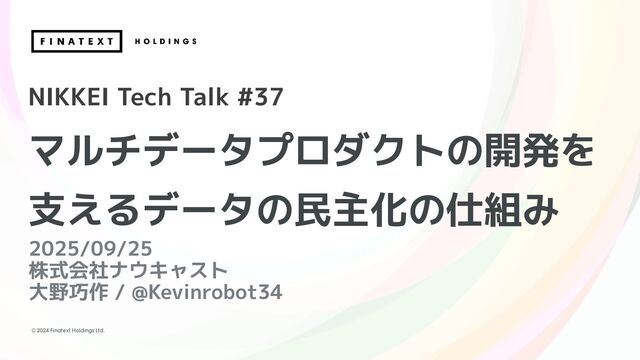 © 2024 Finatext Holdings Ltd. マルチデータプロダクトの開発を 支えるデータの民主化の仕組み 2025/09/25 株式会社ナウキャスト 大野巧作