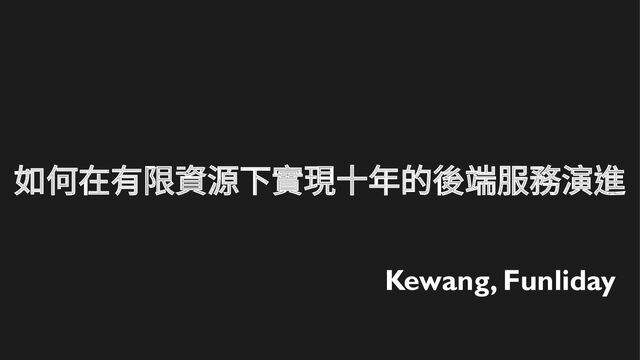 / MongoDB / Elasticsearch / HBase • Git / DevOps • 熱愛開源 Linkedin Linkedin kewangtw kewangtw SlideShare SlideShare kewang kewang Gmail Gmail cpckewang cpckewang Facebook Facebook Kewang 的資訊進化論 Kewang 的資訊進化論 devopsday taipei devopsday taipei '17 '17 hadoopcon hadoopcon '14 '15 '14 '15 jcconf jcconf '16 '17 '18 '16 '17 '18 GitHub GitHub kewang kewang Funliday Funliday kewang kewang modernweb modernweb '18 '19 '20 '21 '18 '19 '20 '21 coscup coscup '20 '21 '20 '21 mopcon mopcon '14 '20 '22 '14 '20 '22