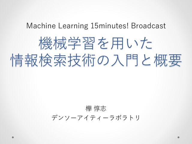 • 代表的な応⽤:Web 検索システム/エンジン o 膨⼤な Web ページを全て確認することは不可 • 主要な検索システム o Google search, Microsoft Bing, Yahoo search, Baidu (百度) 2021.8.28 4 18.8億 Web サイト 55 億 Web ページ https://www.worldwidewebsize.com/ http://www.internetlivestats.com/tot al-number-of-websites/ Machine Learning 15minutes! Broadcast: 機械学習を⽤いた情報検索技術の⼊⾨と概要