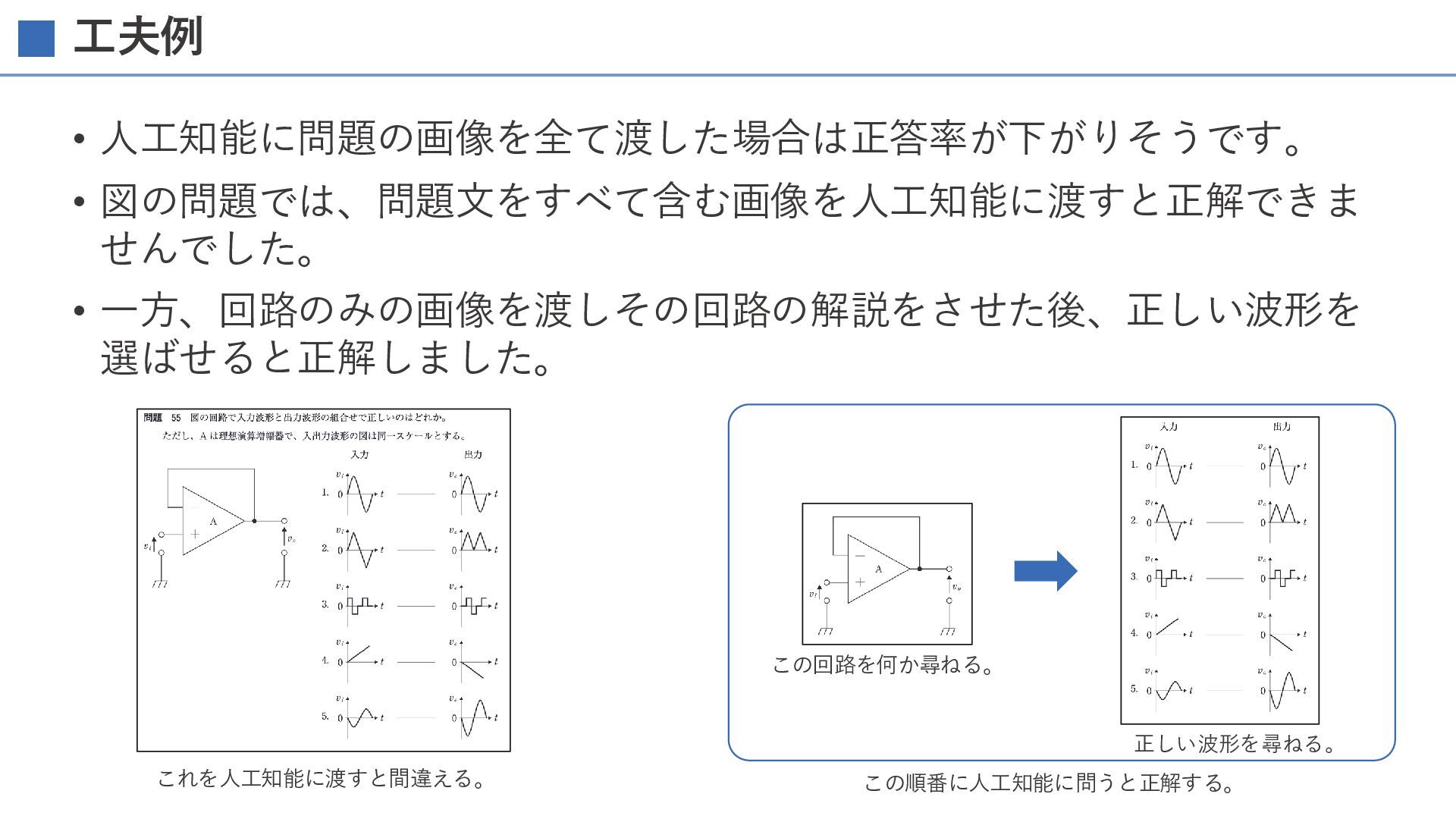 工夫例 • 人工知能に問題の画像を全て渡した場合は正答率が下がりそうです。 • 図の問題では、問題文をすべて含む画像を人工知能に渡すと正解できま せんでした。 • 一方、回路のみの画像を渡しその回路の解説をさせた後、正しい波形を 選ばせると正解しました。 これを人工知能に渡すと間違える。