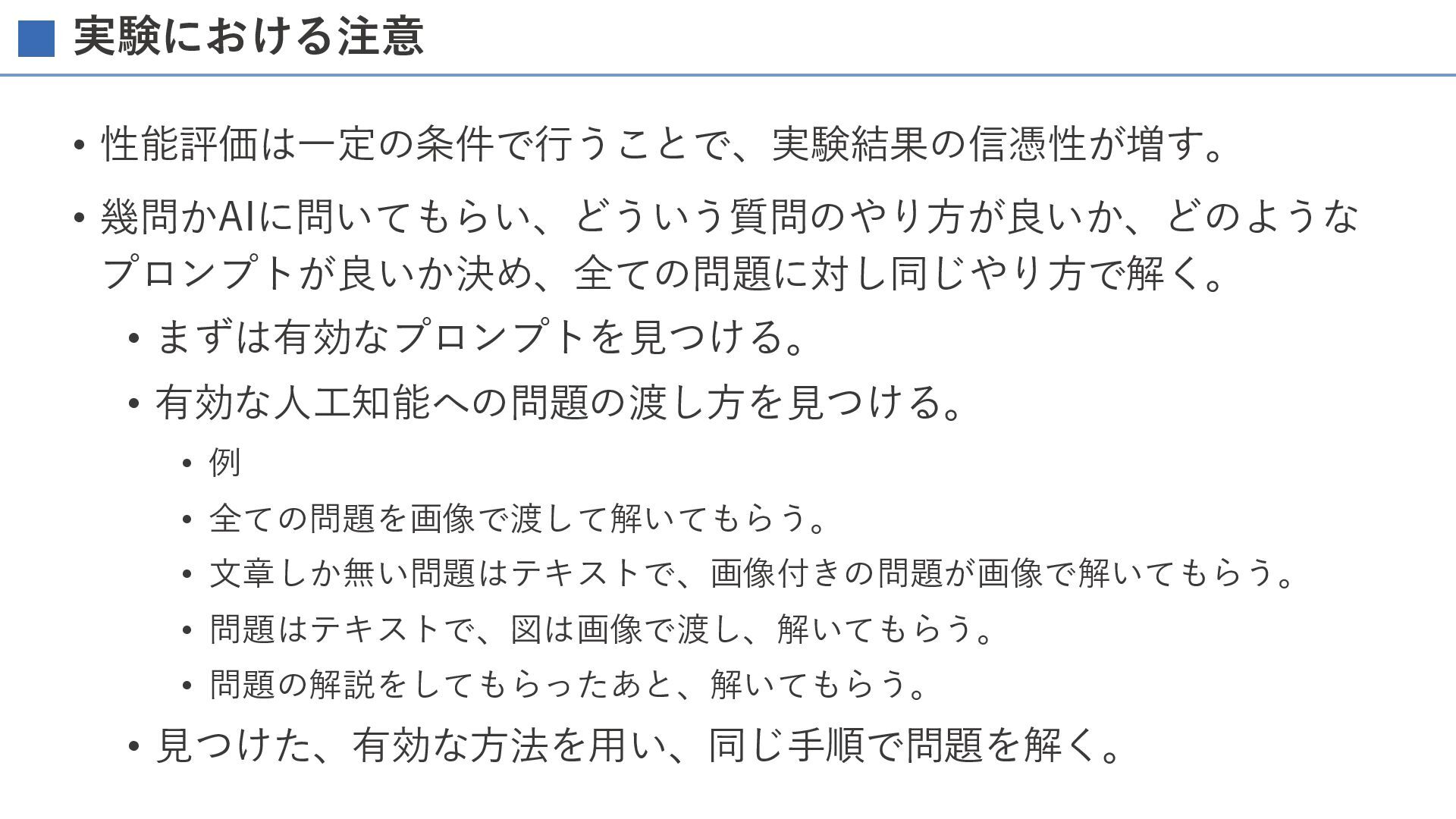 実験における注意 • 性能評価は一定の条件で行うことで、実験結果の信憑性が増す。 • 幾問かAIに問いてもらい、どういう質問のやり方が良いか、どのような プロンプトが良いか決め、全ての問題に対し同じやり方で解く。 • まずは有効なプロンプトを見つける。 • 有効な人工知能への問題の渡し方を見つける。
