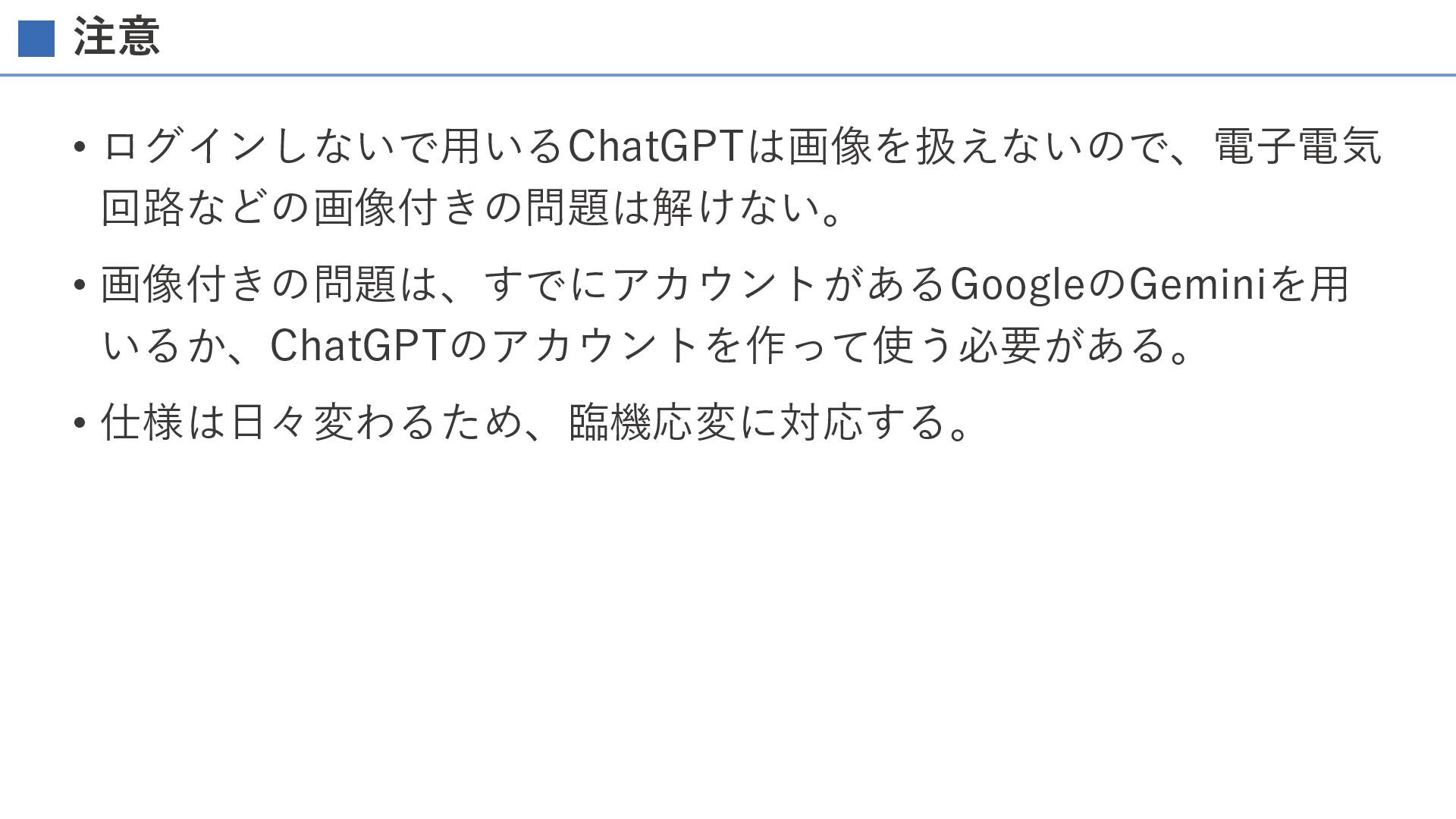 注意 • ログインしないで用いるChatGPTは画像を扱えないので、電子電気 回路などの画像付きの問題は解けない。 • 画像付きの問題は、すでにアカウントがあるGoogleのGeminiを用 いるか、ChatGPTのアカウントを作って使う必要がある。 • 仕様は日々変わるため、臨機応変に対応する。