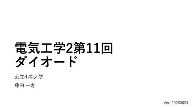 = −0.6 2. 𝑉 𝑜𝑚𝑎𝑥 = 0.6, 𝑉𝑜𝑚𝑖𝑛 = −3.0 3. 𝑉 𝑜𝑚𝑎𝑥 = 3.0, 𝑉𝑜𝑚𝑖𝑛 = −3.0 4. 𝑉 𝑜𝑚𝑎𝑥 = 3.6, 𝑉𝑜𝑚𝑖𝑛 = −3.6 5. 𝑉 𝑜𝑚𝑎𝑥 = 6.0, 𝑉𝑜𝑚𝑖𝑛 = −6.0 -0.6 3.0 Viを十分に大きくするとVoは上のダイオードには,ツェナー電圧の3.0Vが加わる.その時,下のダイオー ドの順方向電圧を超えているので,下のダイオードは電流の流れを阻害しない.しかし,電圧降下0.6Vが 生じている.よって,Vomaxは3+0.6=3.6V. 同様に,Viを十分低くすると,Voは下のダイオードのツェナー電圧3.0Vのため,下のダイオードに加わる 電圧は-3.0Vで一定となる.このとき上のダイオードの順方向電圧を超えているので,上のダイオードは電 流の流れを阻害しない.しかし,電圧降下が-0.6V生じる.よって,Vominは-3.0-0.6=-3.6Vである. 上のダイオード 下のダイオード