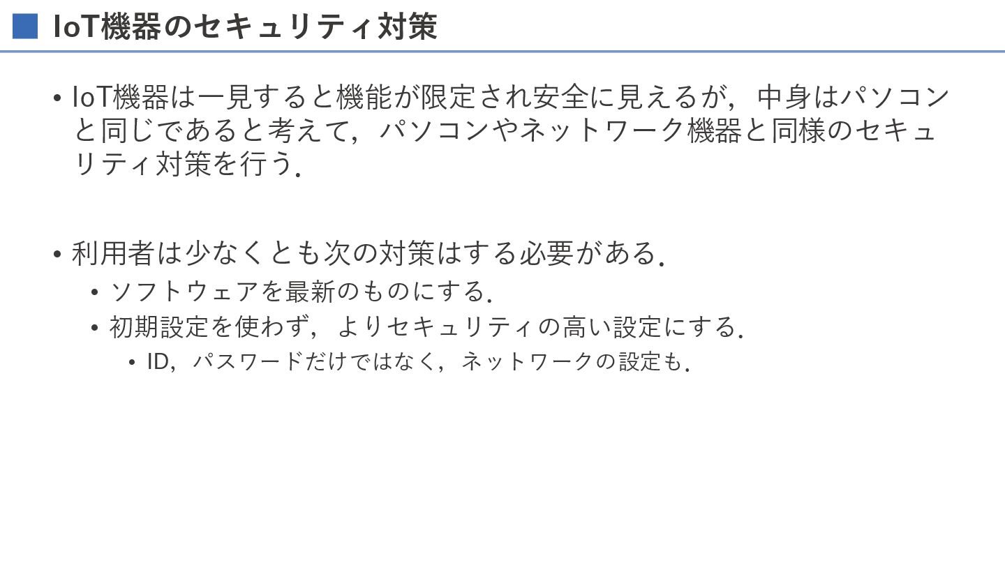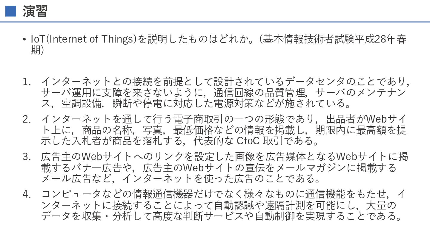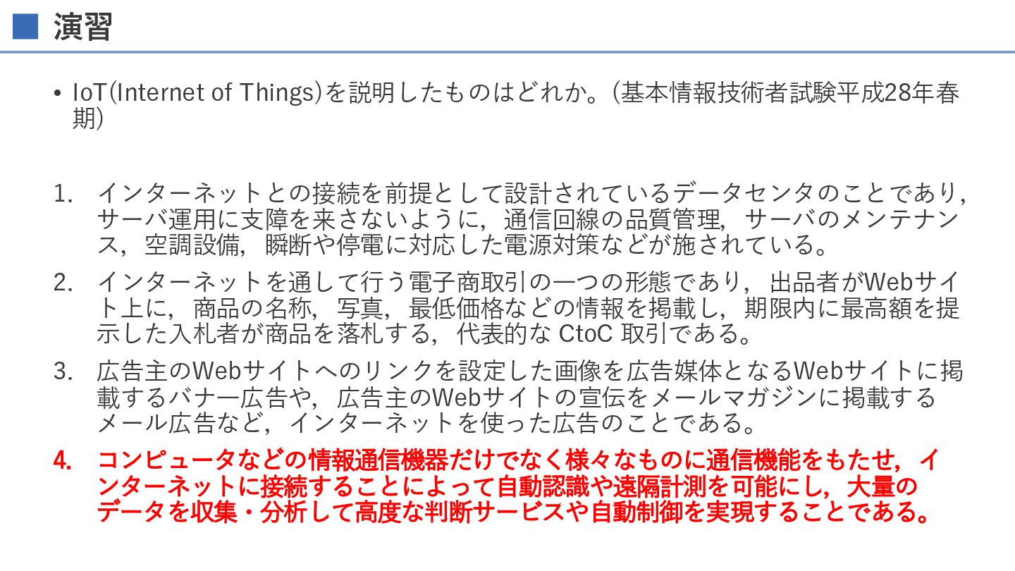 ハードウェア・産業構造 • 第4回 ソフトウェアの種類・ライセ ンス・特許 • 第5回 インターネットとビジネス • 第6回 コンピュータネットワークの 仕組み • 第7回 情報セキュリティ • 第8回 IoTとビッグデータ • 第9回 人工知能1 -人工知能時代の 到来- • 第10回 人工知能2 -人工知能を実現 するには- • 第11回 人工知能3 -人工知能の技術 - • 第12回 人工知能4 -人工知能を使い こなす上で必要な能力- • 第13回 人工知能5 -人工知能研究者 はどこに進めばよいのか- • 第14回 人工知能6 -プロンプトエン ジニアリング- • 第15回 人工知能7 -人工知能のリス ク-