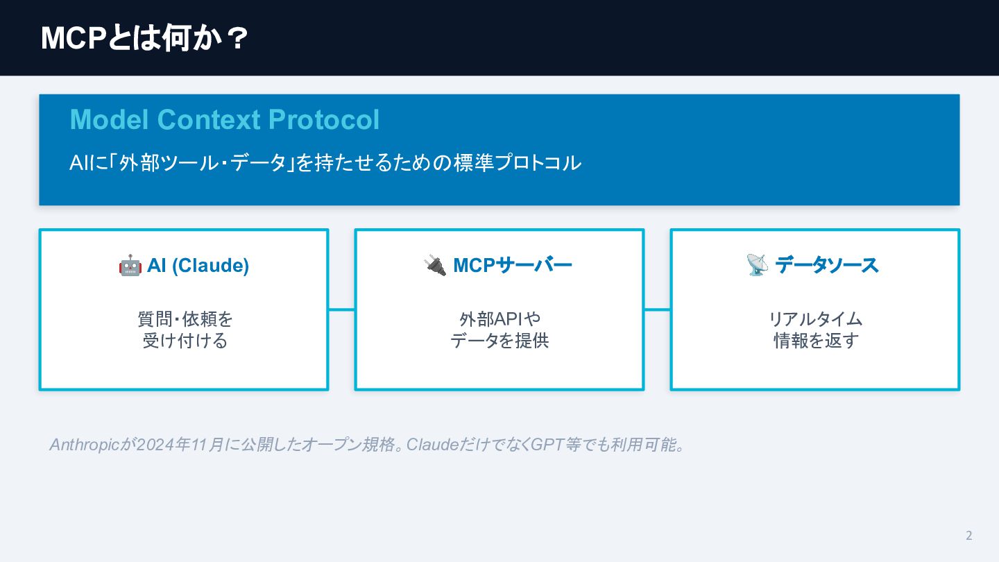 🔌 MCPサーバー 外部APIや データを提供 📡 データソース リアルタイム 情報を返す Anthropicが2024年11月に公開したオープン規格。ClaudeだけでなくGPT等でも利用可能。 2