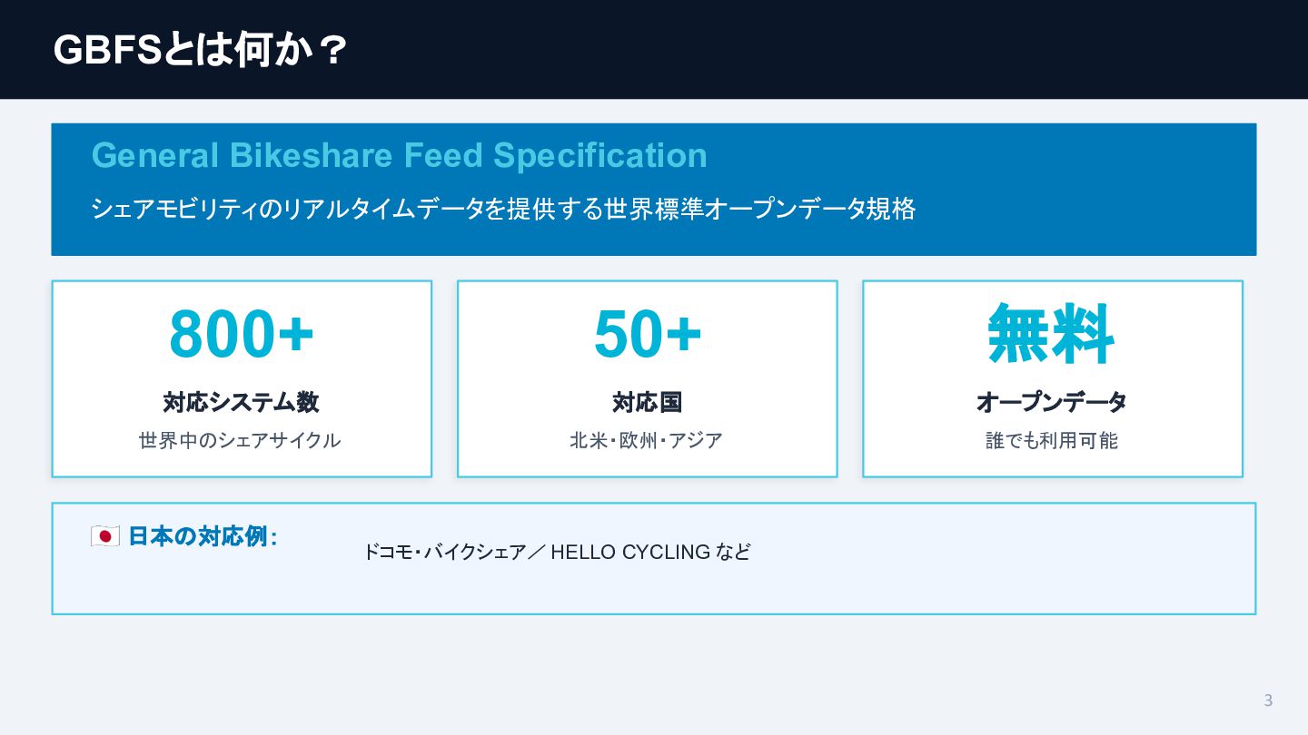 対応国 北米・欧州・アジア 無料 オープンデータ 誰でも利用可能 日本の対応例: ドコモ・バイクシェア/ HELLO CYCLING など 3
