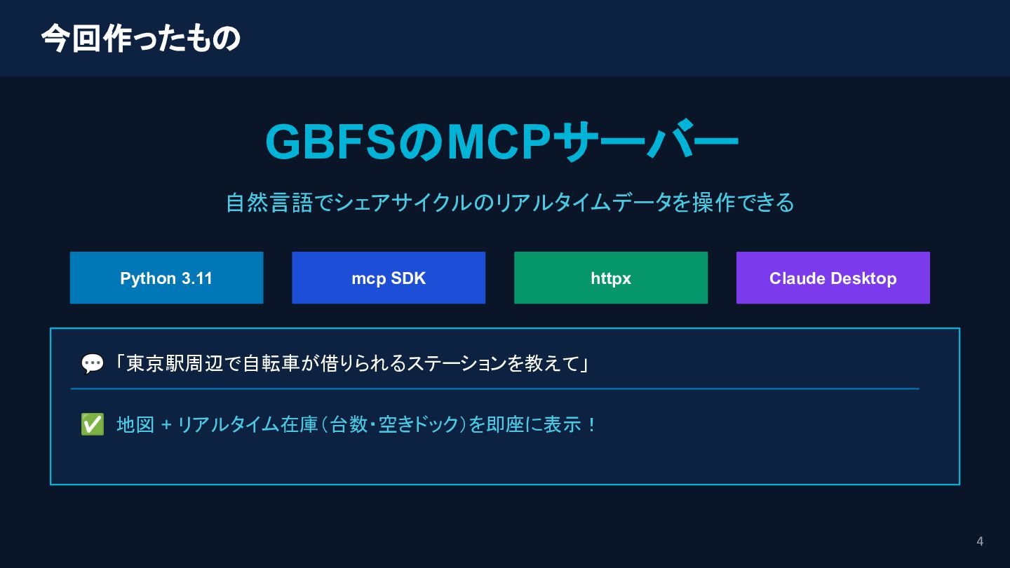 今回作ったもの GBFSのMCPサーバー 自然言語でシェアサイクルのリアルタイムデータを操作できる Python 3.11 mcp SDK httpx Claude Desktop